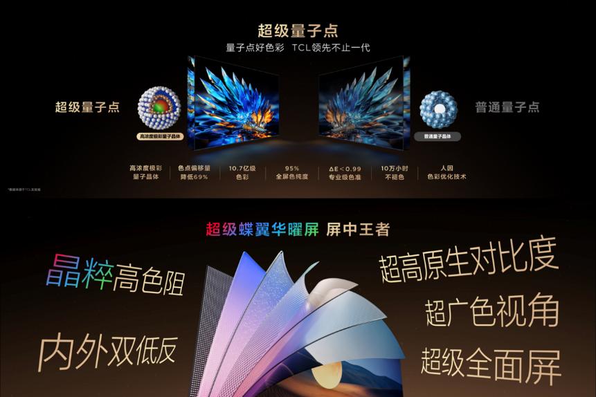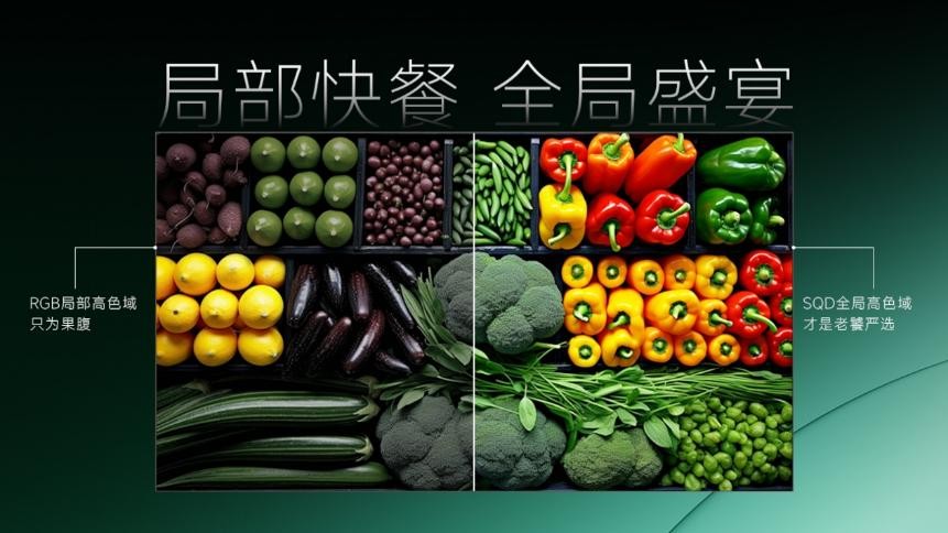 SQD-Mini LED则是通过超级量子点材料与超级蝶翼华曜屏的黄金组合,构建起了一套全链路色彩优化体系,从底层逻辑上实现了对RGB-Mini LED的“降维打击”,其超级量子点的超级光谱与屏幕的穿透光谱完美匹配,实现了极致的“光谱收敛”,让每种色彩都达到最精准的饱和度与还原度,真正做到了100%BT.2020 全局高色域。色彩以极致饱满和极致克制,呈现出完美还原肉眼所见的张力,色彩的真实性呼之欲出。