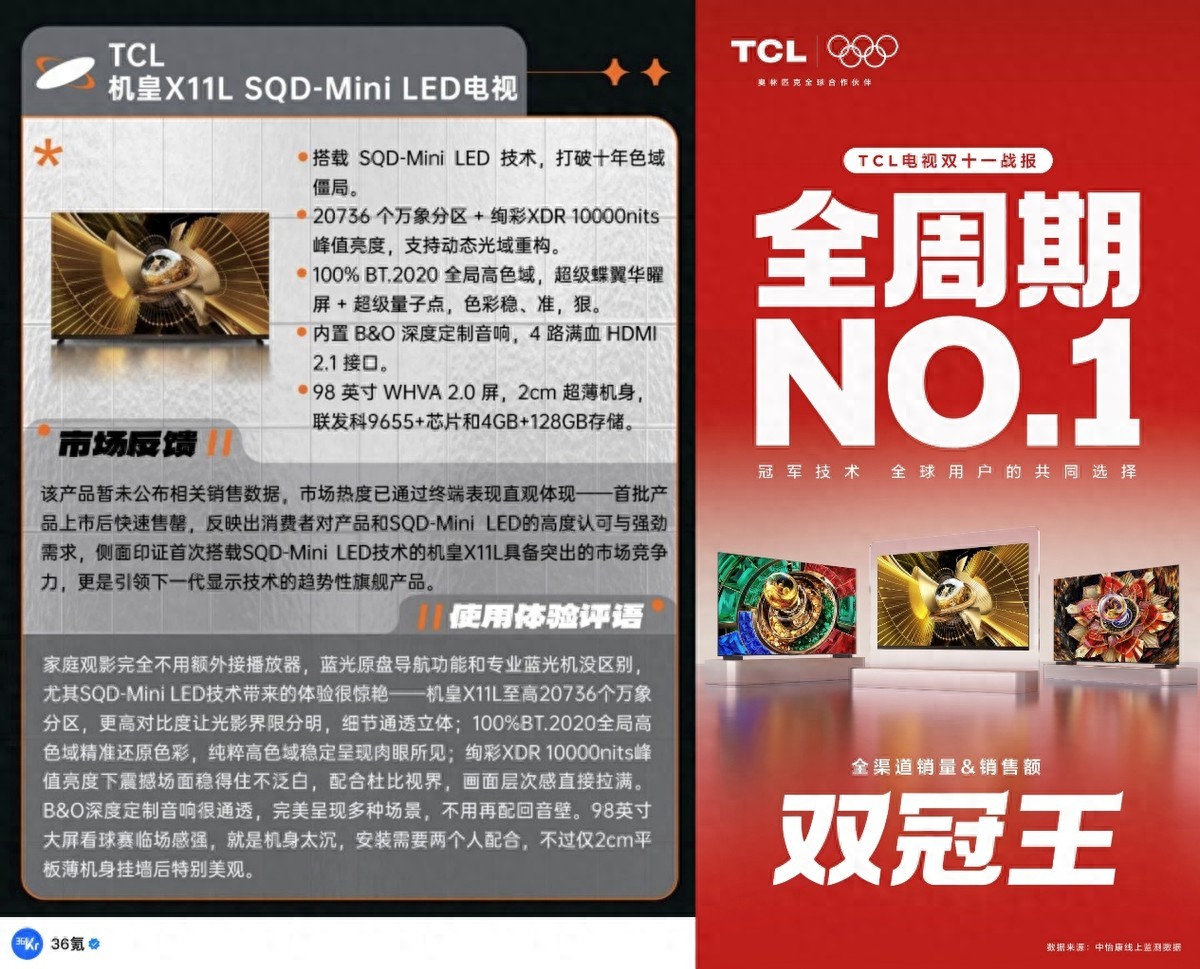 近日,TCL机皇X11L凭借SQD-Mini LED技术,在36氪WISE2025商业之王大会上斩获'年度焦点产品'大奖,用硬核实力打破行业十年色域困局。更值得关注的是,TCL今年双十一全渠道狂揽销量&销售额双冠王,市场热度与技术创新形成完美共振。