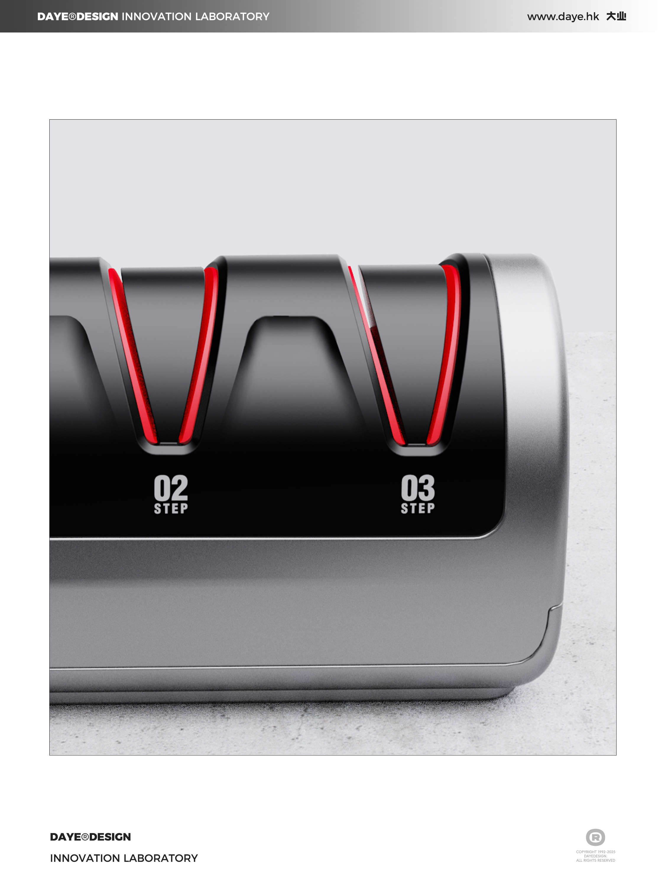 产品采用银灰与黑色为主的工业配色体系,银灰色主体传递金属工具的坚固耐用与精密质感,黑色功能区形成视觉聚焦,强化操作区域的识别度;红色装饰条作为功能分区的 “视觉锚点”,既在视觉上划分出不同磨刀步骤的区域,又以强烈的色彩对比传递 “操作警示” 的设计语言,让用户直观识别每一步的功能差异。 整体遵循流线型工业造型,手柄的大尺寸镂空设计既符合人体工学的握持逻辑,又通过 “几何镂空” 的形态语言塑造出工具的力量感。设备整体的曲面与棱线过渡自然,既具备工业产品的 “机械精密感”,又弱化了工具类产品的 “生硬感”,让外观兼具 “实用工具” 与 “工业设计单品” 的双重属性。