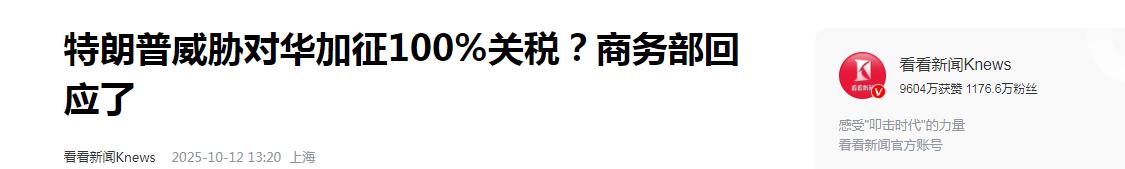 10月10日,特朗普在社交媒体上连续发布多条推文,威胁对中国商品加征100%关税,并指责中国对稀土的出口管制是“绑架全球经济”。