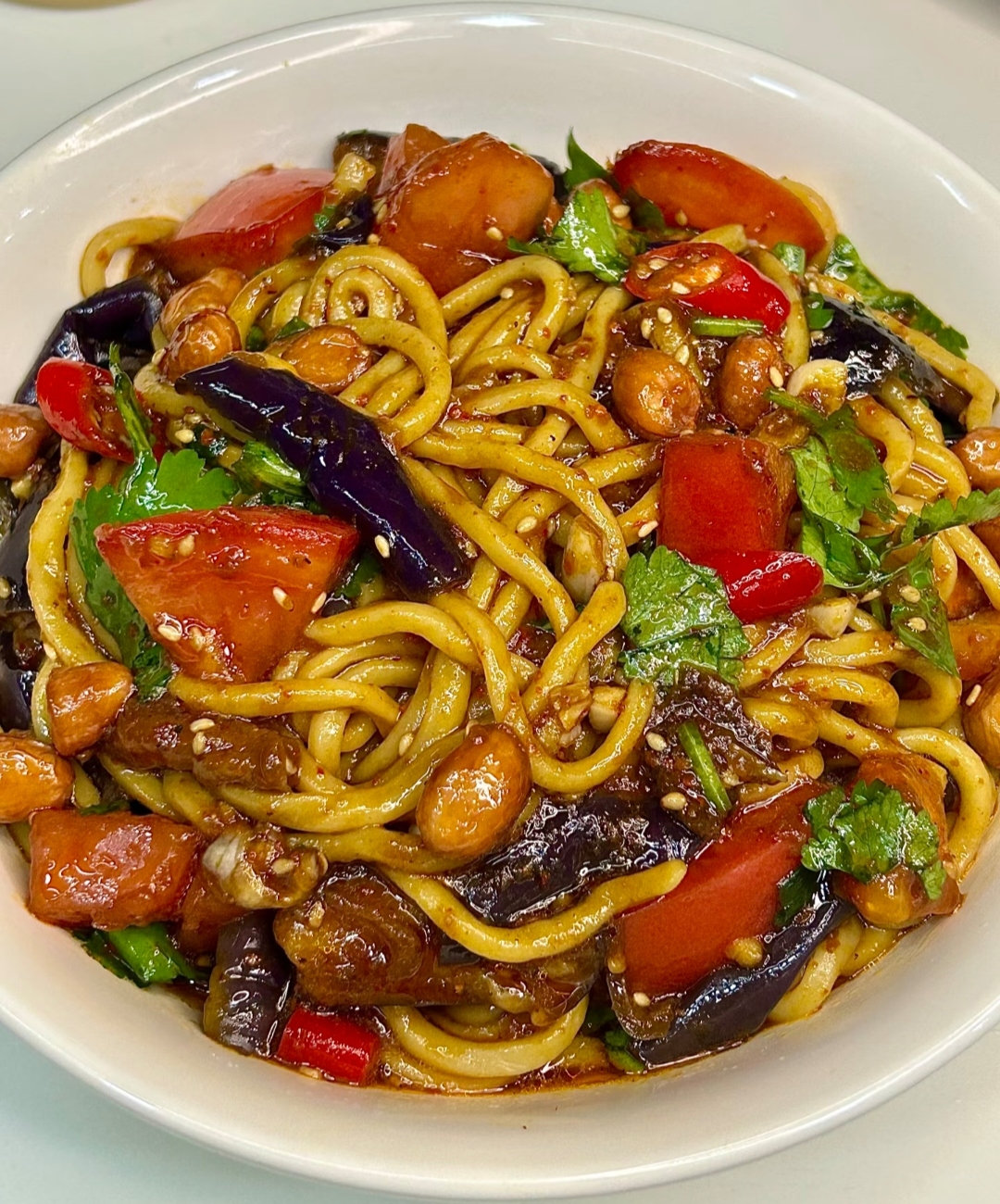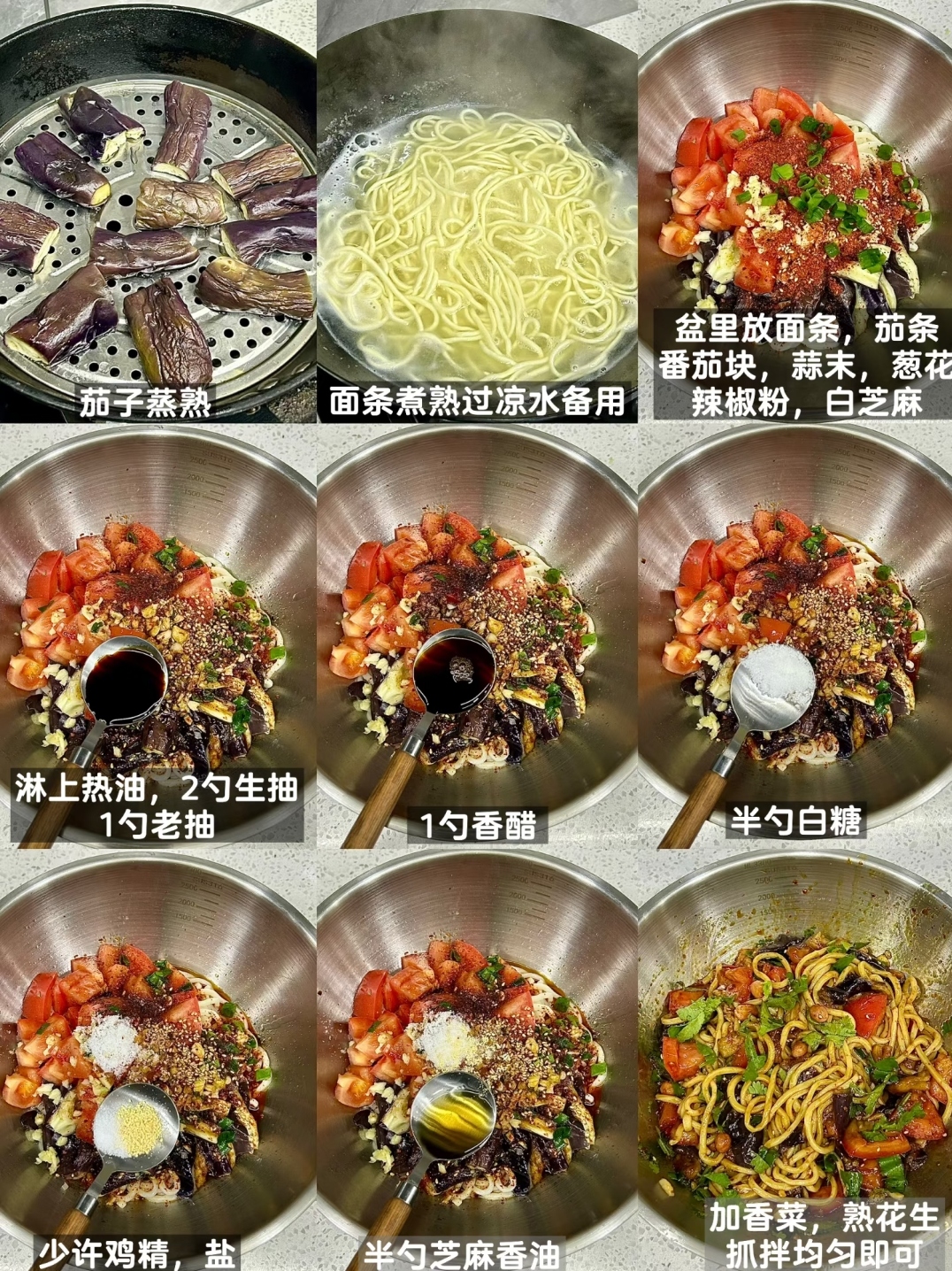 12-15 分钟:组装!大盆里先铺面条,再铺茄条、番茄块,淋酱汁,撒花生、香菜、葱花。戴一次性手套(防辣手),从下往上翻拌 30 秒,让每一根面条都裹上红油,茄子被“按摩”成天然肉酱,番茄偷偷渗出酸汁,完工!