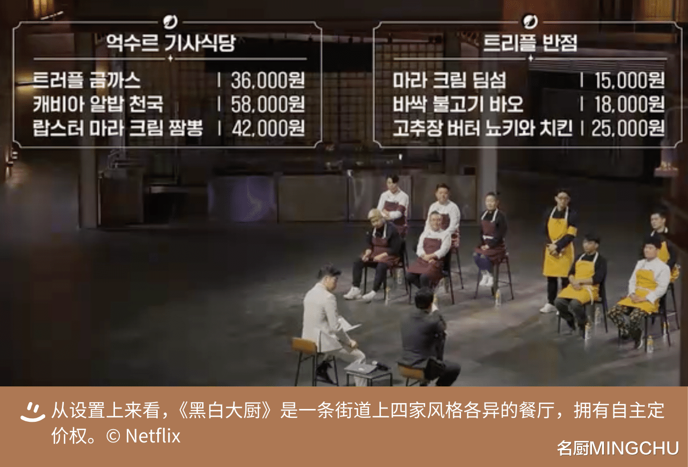 场景的构建真实吗?与混乱的《一饭封神》不同,《黑白大厨》中的四家餐厅面对的场景异常的简洁。大胃王吃播主拥有无限的金钱,用来模拟现实中一轮又一轮的经营状态,菜品的味道直接影响到是否复购。四家餐厅单道菜的价格都在百元左右,最便宜的为 15000 韩元(约 78元),最贵的为 58000 韩元(约 300 元)。