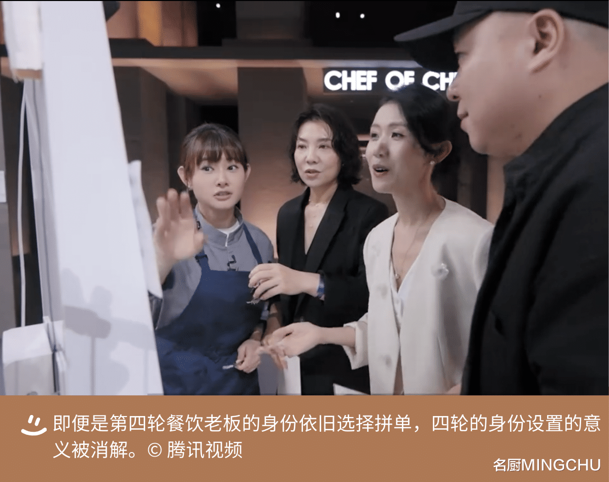 从博弈论看,设定为固定金额便将自由竞争变成了零和博弈,即买了一家的东西买不起别家的。而作为食客难免产生想要多尝一些菜,从而寻找新的办法,拼单便产生了。节目组设置的四组身份,从消费决策来说相差无几。从节目内容和部分博主的 vlog 来看,这种行为确实大量存在。而从最后的经营额更是说明了问题,所有餐厅的经营额都均匀地分布在所有金钱 20000 元的四分之一 5000 元左右。最高为 5200 元,最低为 4462 元,差距不过是 738 元,平摊到每一轮差距则更小。这个现象的背后意味着主厨们做出什么样的料理、料理的风味如何都不再重要,因为是都会想方设法地通过拼单来购买。于此,考核的目的一彻底失效。