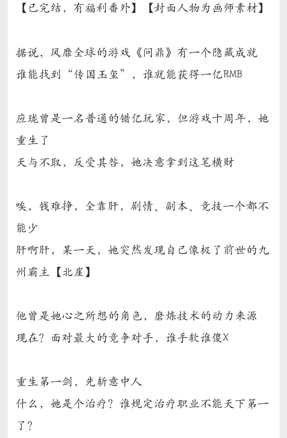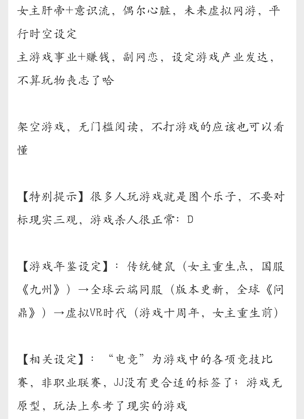 阅读门槛:中下,虽然是正常的网游文,但是看起来有过多的游戏术语,不在无脑看的范畴里,还是略有门槛的。