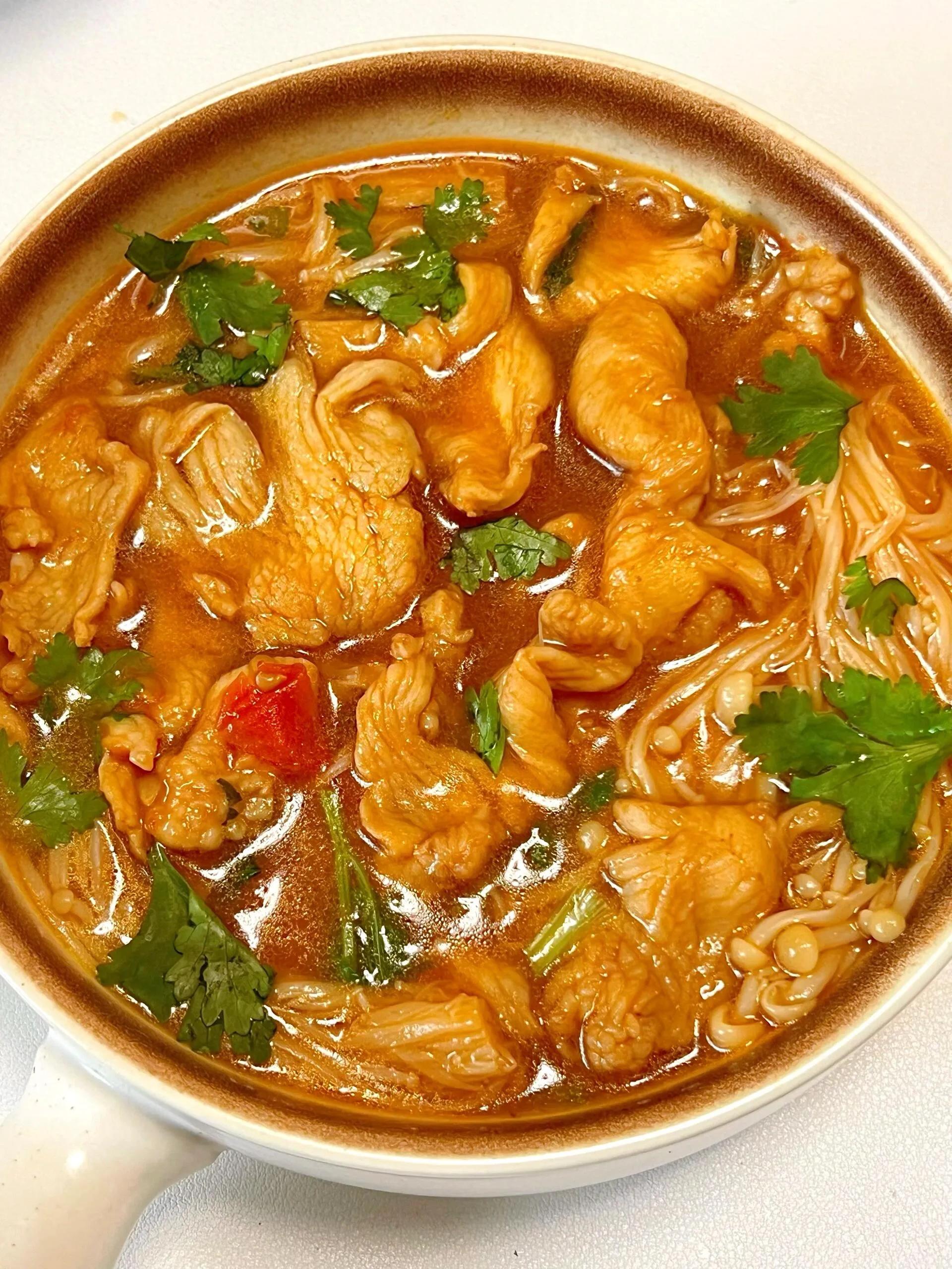 热锅冷油,鸡胸肉下锅煎到表面微焦,像给肉块穿上金黄的“外衣”。这时候别急着盛出来,用锅里的肉香油炒番茄块——番茄要炒到“软乎乎”的,用锅铲压一压,让番茄汁儿哗啦啦流出来,这样汤底才会浓稠酸甜!接着加金针菇,倒小半碗水,盖上锅盖焖5分钟——这一步像给食材“蒸桑拿”,让金针菇吸饱番茄的酸甜,鸡胸肉吸饱汤汁,嫩到咬一口就化在嘴里!