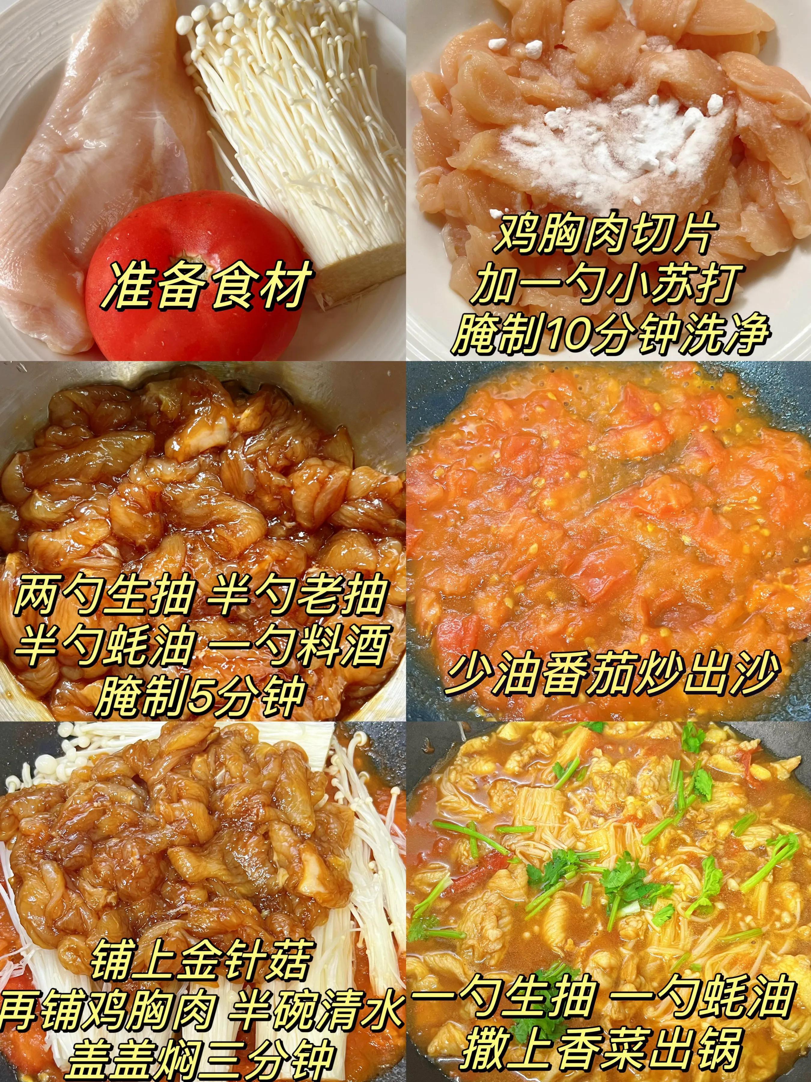 鸡胸肉得选“粉嘟嘟”的——颜色鲜红、按压有弹性的,这样的肉更嫩不柴。番茄要挑“摸起来软乎”的,熟透的番茄酸甜多汁,煮起来更容易出沙。金针菇选“根须白净”的,洗的时候别撕太碎,保留点脆劲儿才好吃!腌肉是关键:鸡胸肉切块后,用料酒、生抽、黑胡椒、淀粉抓匀,腌15分钟——淀粉像给肉穿了一层“锁水衣”,煎的时候更嫩不粘锅!