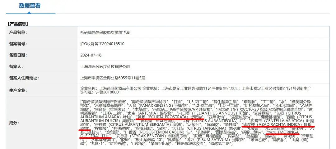 听研琉光恒采胶原次抛精华液也被曝含有鳢肠提取物、印度楝叶提取物、辣木籽油,国产普通化妆品备案信息以及天猫听研旗舰店客服提供的成分表均含有这三种物质。不过天猫和京东平台旗舰店均搜索不到这款产品,客服表示产品售罄无货。