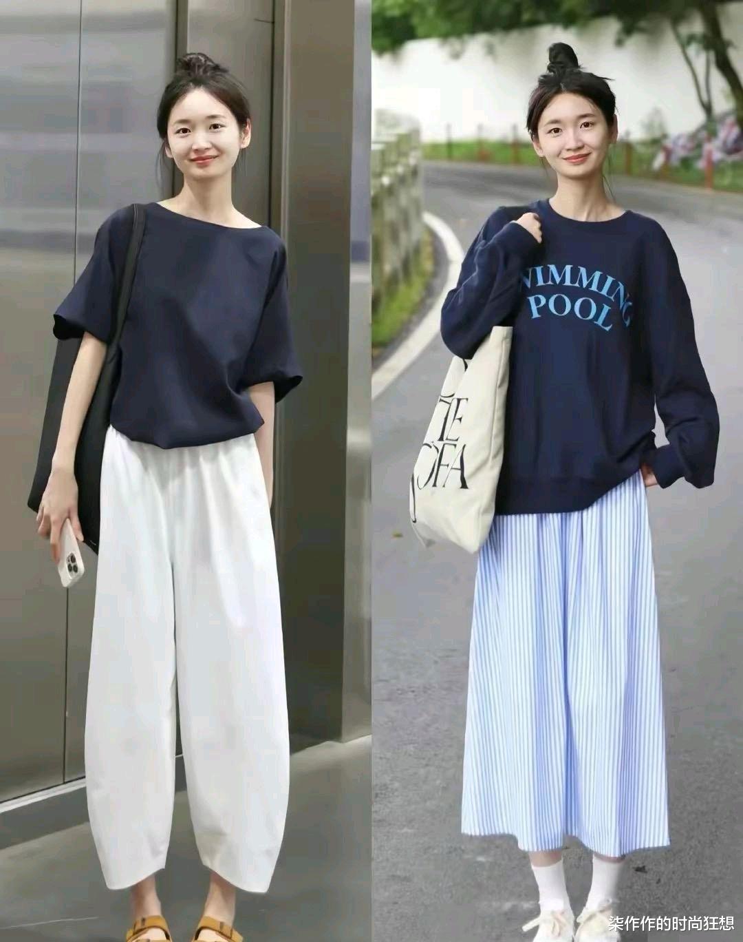 藏蓝色的卫衣,简单的设计轻松自然,搭配白色休闲裤或是水蓝色阔腿裤,都感觉很舒服减龄。