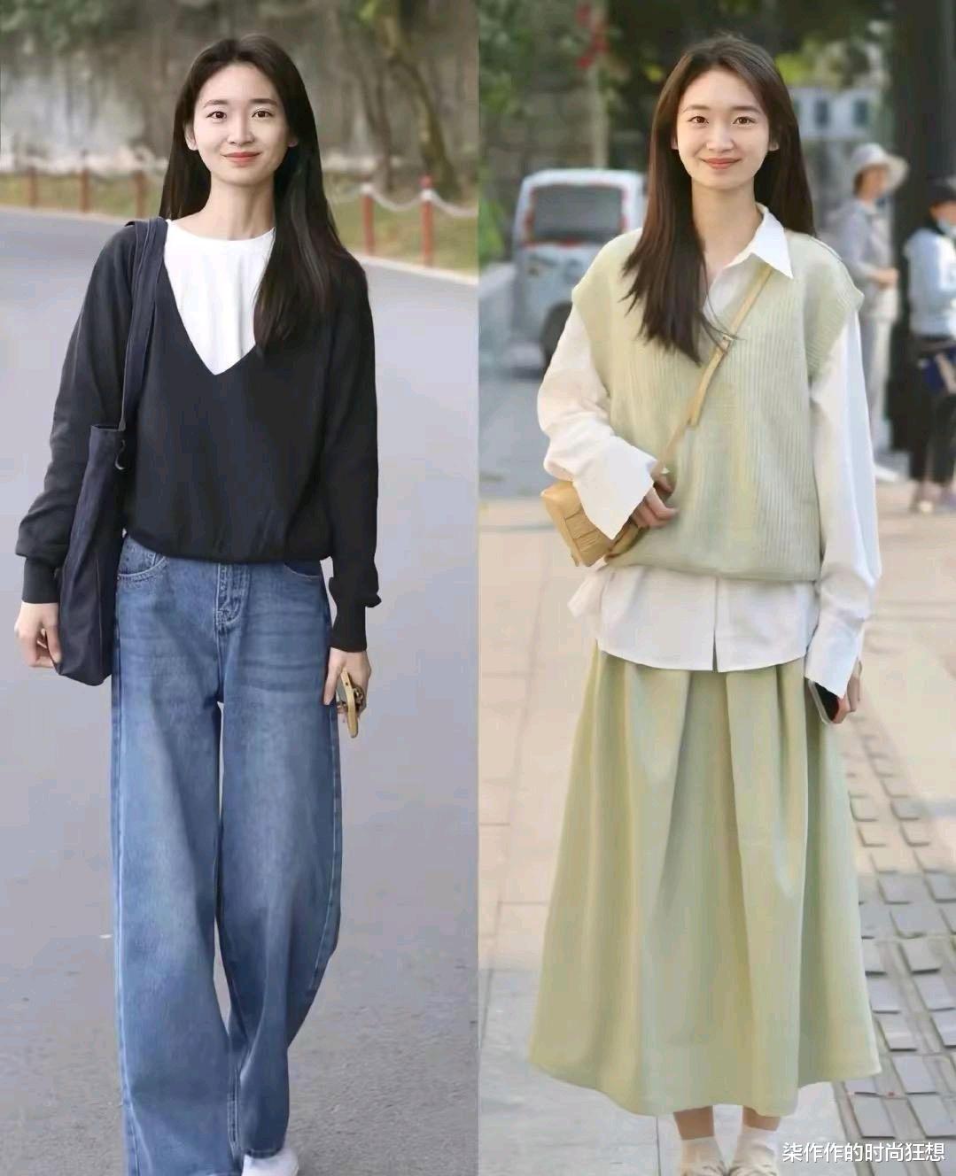 白色衬衫叠穿灰蒙绿色的毛衣背心,露出衬衫的衣角可以穿出层次感来,又增加了清新感,搭配同色系的长裙,很小清新的感觉。