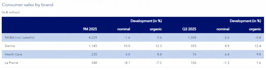 总的来说,Derma(优色林、Aquaphor等)业务以12.3%的有机增长持续领跑,而核心品牌妮维雅仅微增0.6%,高端品牌莱珀妮前九个月累计销售额仍下降 7.2%,但在第三季度已重返增长轨道,实现了1.6%的有机增长。1.Derma与Health Care:双重增长