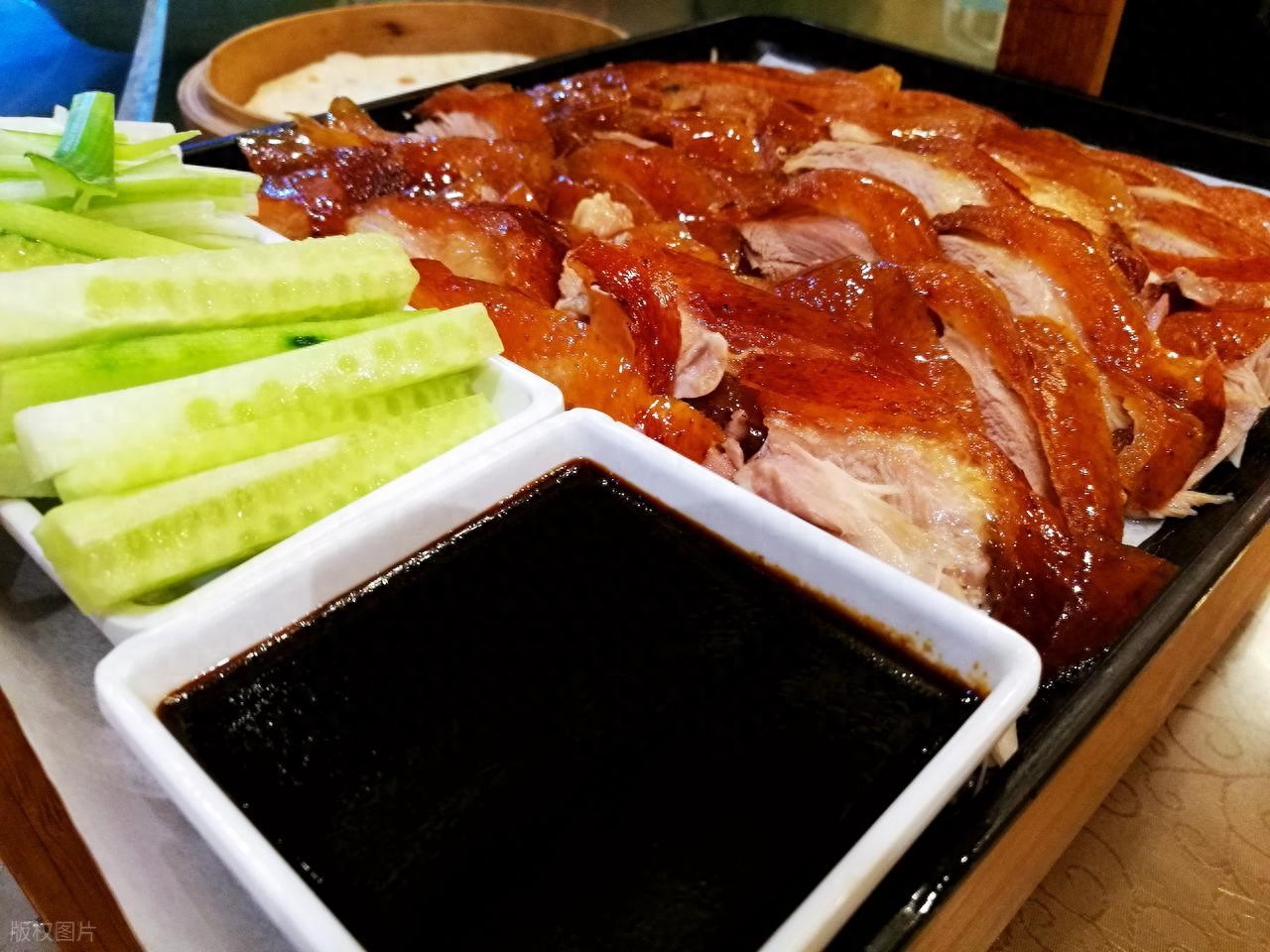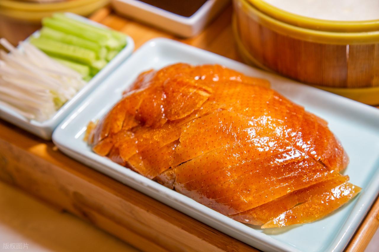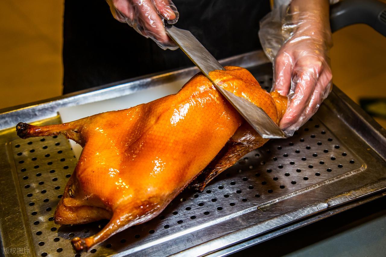 刚出炉的烤鸭油光锃亮,枣红色的脆皮上还挂着晶莹的油珠,轻轻一咬就“咔嚓”作响,酥得掉渣。