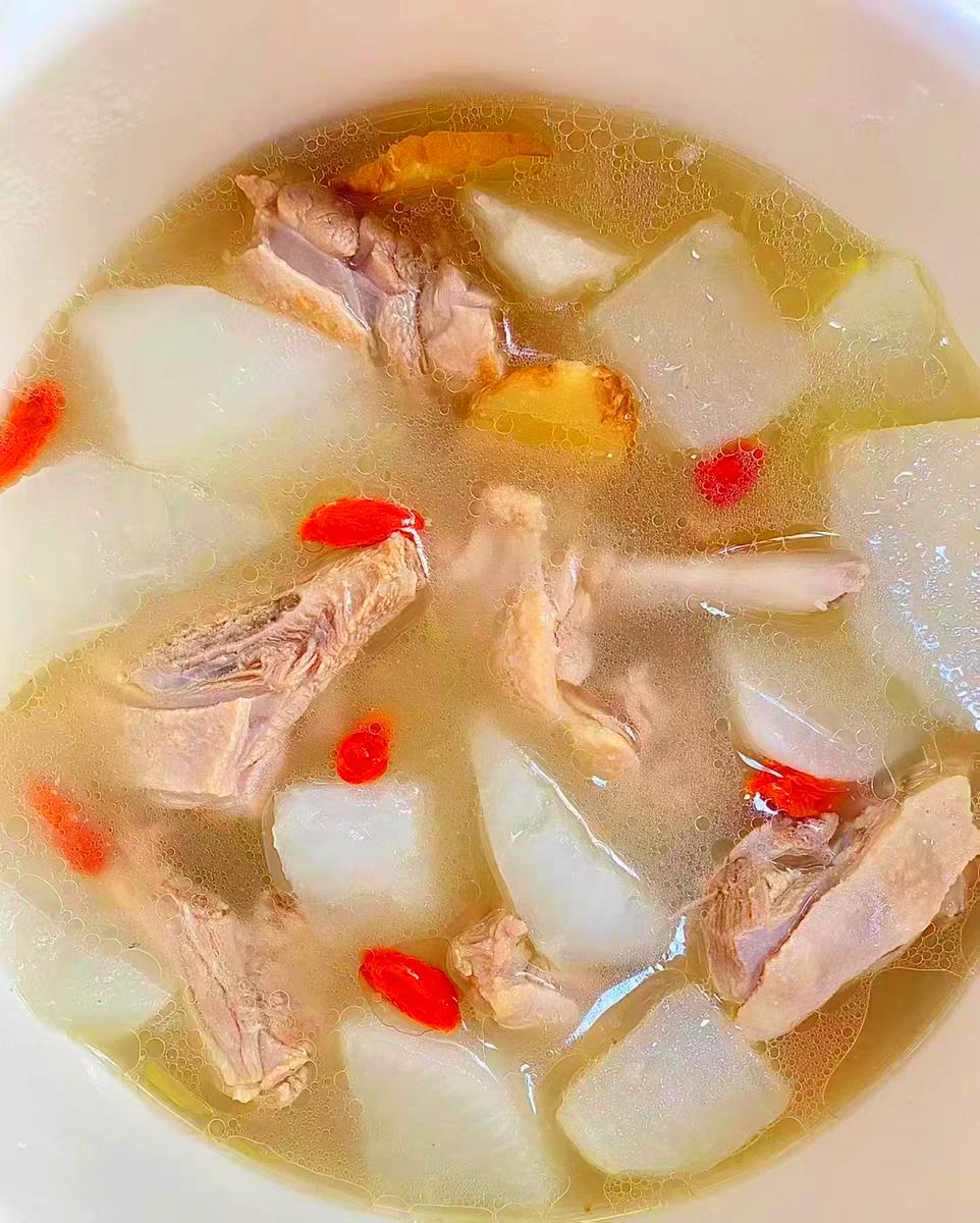 3.继续炖煮15分钟左右,煮至冬瓜变得软烂、透明后开锅,撒入一把泡软的枸杞,再加入适量的盐、少许白胡椒粉调味,用勺子搅拌均匀后关火,美味即成!