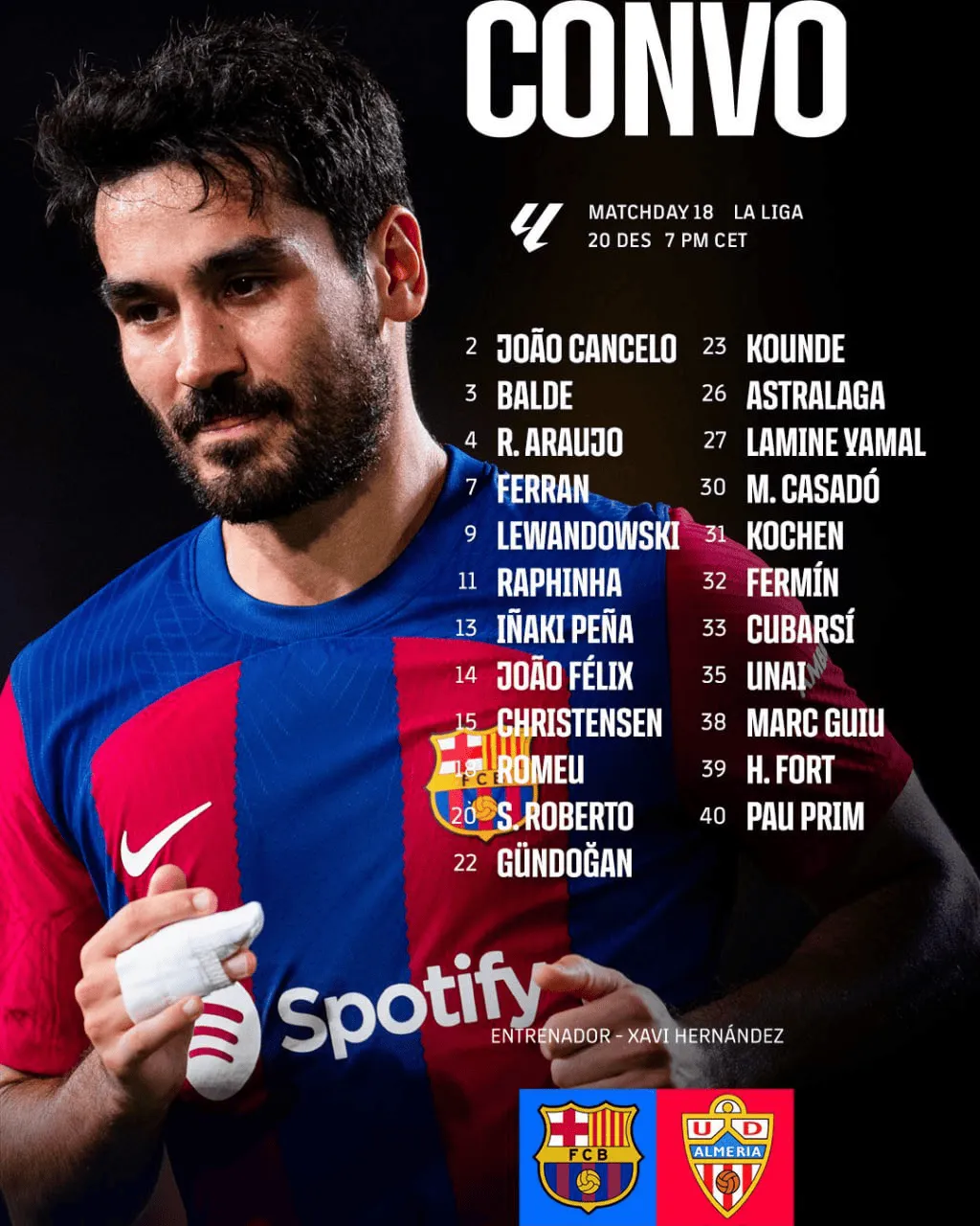 巴塞罗那将在明天凌晨2点迎战阿尔梅里亚,备战情况备受关注。今日,巴萨官方公布了这场比赛的大名单,23人名单中仅有13名一线队球员,其他10人均来自梯队。备受期待的佩德里因伤缺席,而德容则因停赛无法登场。