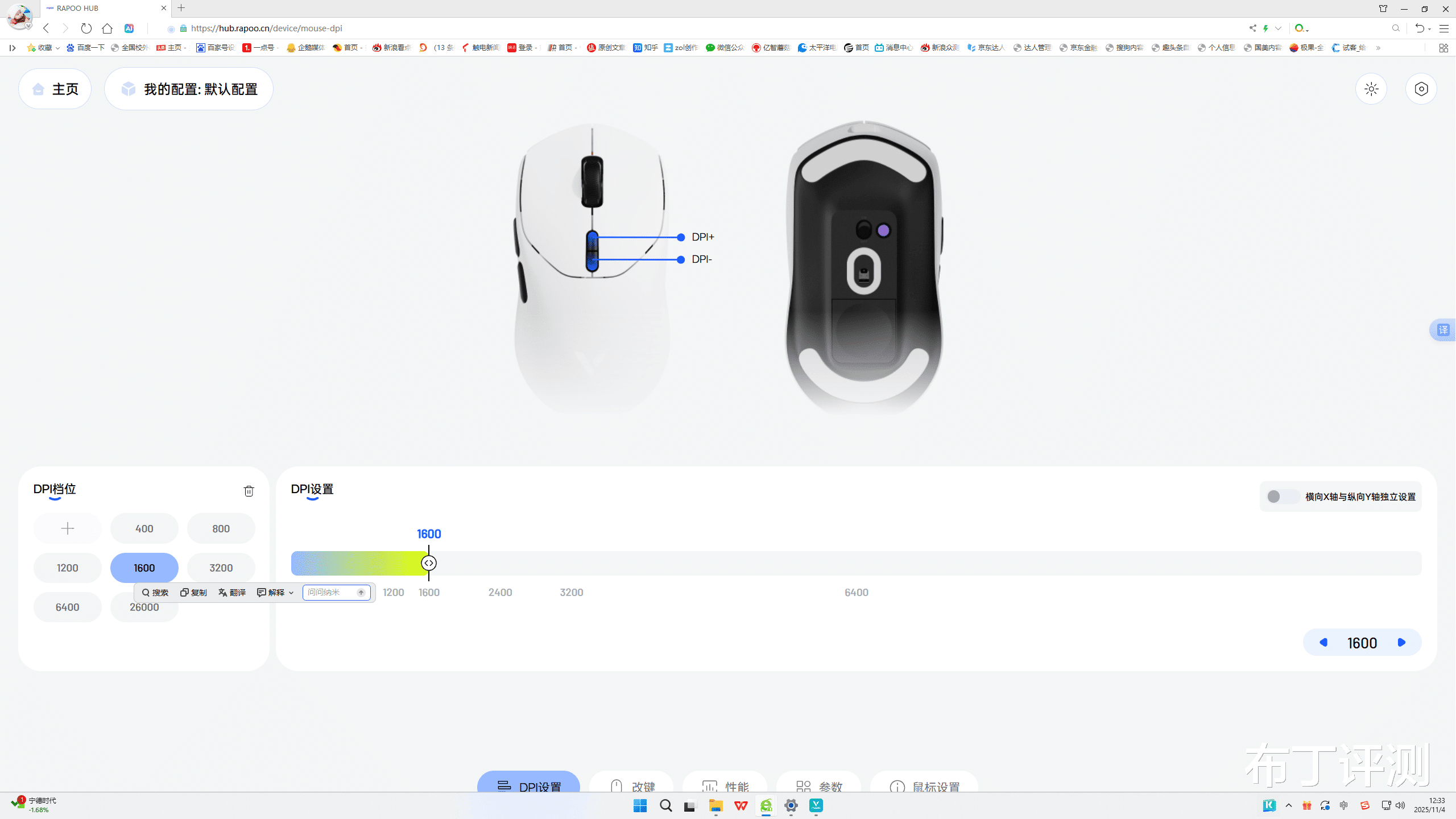 进入到驱动主界面,可以看到被划分为了DPI配置、改键、性能、参数、鼠标设置共5个功能界面,能够对鼠标的DPI、按键、静默高度等进行各种设置操作,支持10键自定义、7档回报率、11档静默高度,功能方面还是十分丰富的。
