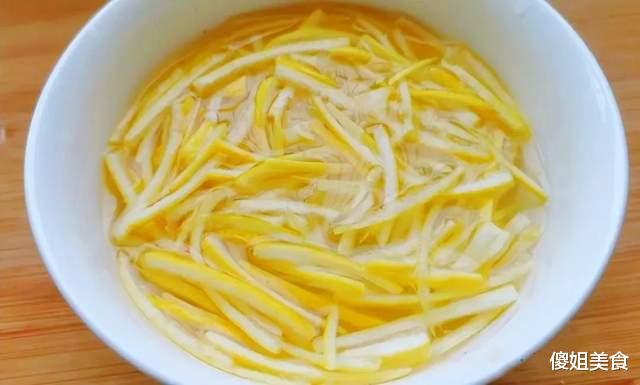 第二步,切好的柚子皮丝放入碗中,加一勺盐,用手轻轻揉搓,直到感觉柚子皮有点出水,然后倒入清水浸泡15分钟,这个步骤能有效去除部分苦味。泡好后捞出,再重复浸泡一次。