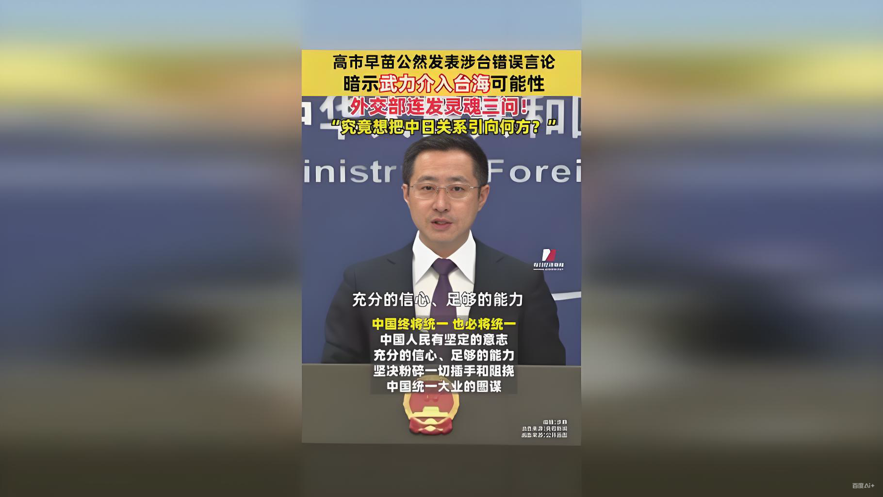 三、外交铁拳砸碎干预幻想面对高市早苗的厥词,中国外交部发言人的回应字字千钧:"台湾问题纯属中国内政,不容任何外部势力干涉。日本个别政客的言论极其危险,完全背离了中日四个政治文件精神和日方在台湾问题上对中方所作的承诺。"这短短几句话,实则蕴含着强大的外交与法律逻辑。