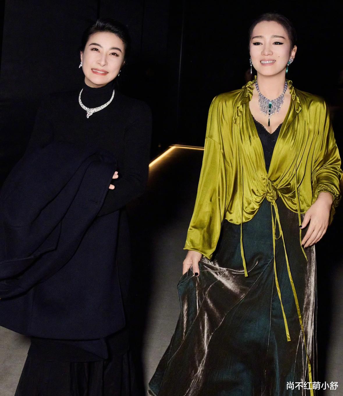 从照片中可以看出,巩俐一袭黑色吊带裙搭配绿色的真丝衬衫,并且随意打结,塑造出高腰线和松弛感,气场非常大。两人的造型同框下对比,备受网友们的议论: