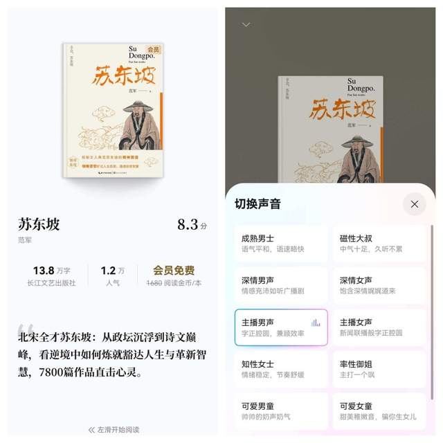 在儿子的带动下,我们全家现在都拟定了自己的阅读计划,比如我就把之前早就想看的《苏东坡传》找了出来,每天利用碎片化的时间读一读。即便是在上下班通勤的路上,我也可以点开“听书”功能,选个“主播男声”的精品音色为我朗读,那浑厚的音色,真有种“专属课堂”的感觉,苏东坡的豁达瞬间治愈了“班味儿”。