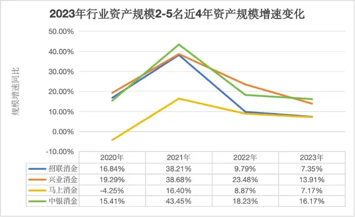 过去四年,招联消金、兴业消金、马上消金和中银消金的资产规模增速呈现出一定的波动性。这与宏观经济环境的不确定性紧密相连,比如,利率的调整、消费者信心的起伏以及政策的变化等。诚然,资产规模扩张是消费金融业绩的重要驱动因素,然而需要指出的是,尽管马上消金的资产规模增速在这四家领军企业中相对较低,但这并不意味着它的业绩表现欠佳。