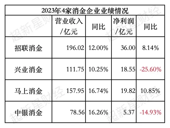 2023年,马上消费金融营业收入达157.95亿元,同比增长16.7%,净利润为19.82亿元,同比增长10.9%。同期,招联消费金融营业收入为 196.02亿元,同比增长12%,净利润36亿元,同比增长8.14%。可见,规模增速不及招联消金的马上消金,在营收和净利增速上均实现反超。与此同时,兴业消金和中银消金的营收增速均不及马上消金,并且这两家的净利润增速在2023年呈现负增长态势。