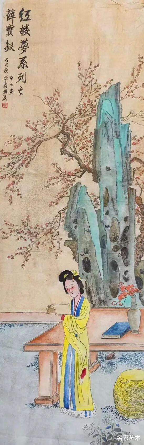 单玉的“观艺术”,首以评论为匙解锁工笔画的文化基因。面对《红楼梦》人物系列,她跳出技法表层,以“画文共生”构建解读逻辑:林黛玉的竹林布景,是“孤高品性”与“绛珠还泪”文学意象的视觉转译;薛宝钗的梅花点缀,成为“温厚沉稳”性格的笔墨注脚。衣饰纹样取舍与神态细微刻画,更串联起原著精神与工笔表达,让画作从“人物肖像”升华为“红楼文化当代载体”,尽显“以小见大”的文化格局。
