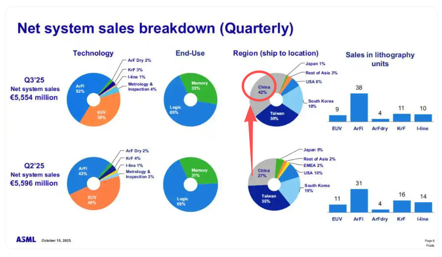 而2025年三季度,随着ASML的业绩发布,我们发现这一季度,ASML似乎又满血复活了,因为中国大陆这一季度,又买走了42%光刻机,超过了中国台湾、韩国等地,再成了全球第一。