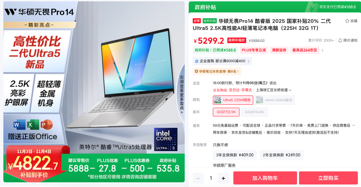 无论是学生党、职场人士还是内容创作者,华硕无畏Pro16 2025都能满足你的需求,让你无需在性能、便携性以及高能用机体验间妥协,助你轻松解锁更全能的旗舰级用机体验。双十一大促,至高可领863.9元政府补贴(购机活动详情还请咨询店内客服),到手7775.1元,全能驾驭多场景用机需求!