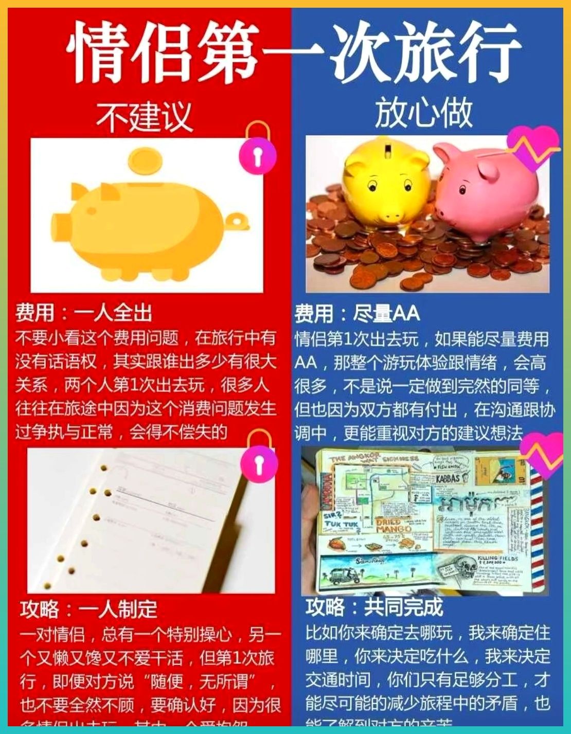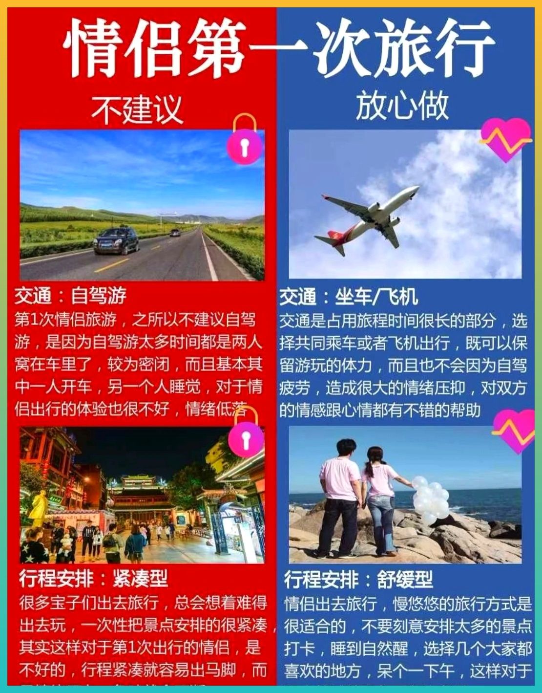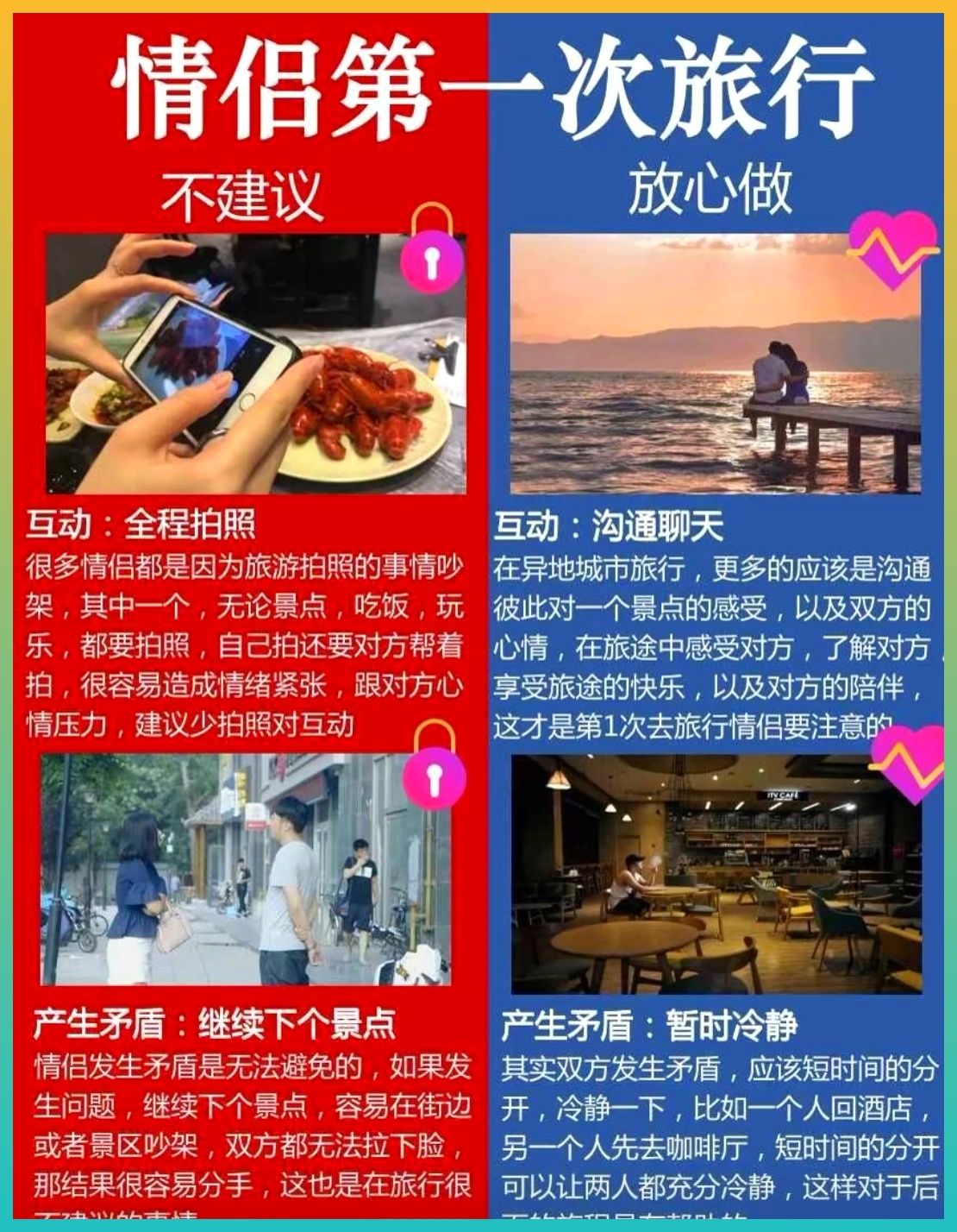 结尾:每一段旅行,都是一场小型爱情实验别追求十全十美。偶尔迷路、偶尔闹别扭,才是属于你们的小故事。第一次旅行不求远、不求多、只求舒服自在,留下点傻傻甜甜的回忆,比什么都值!