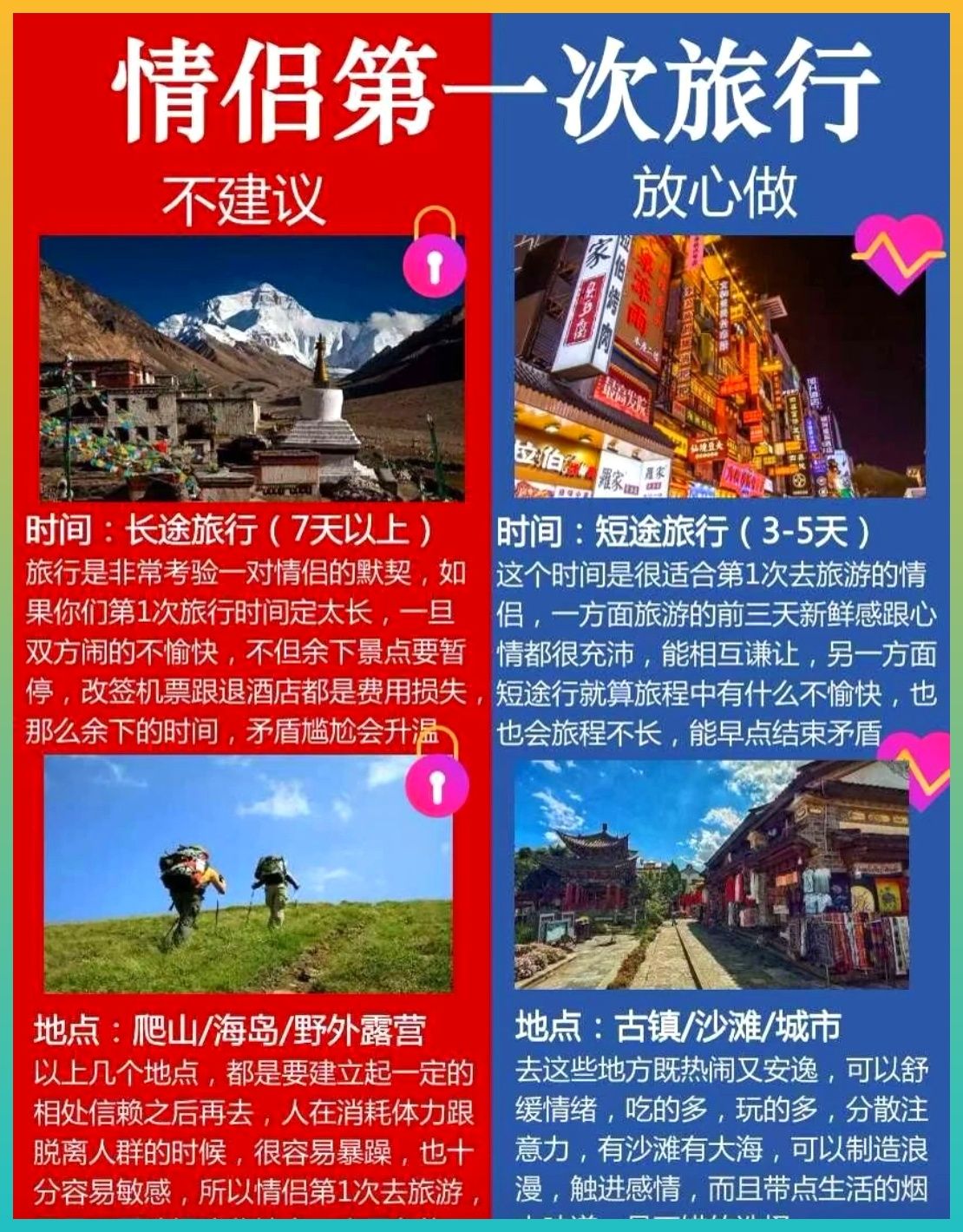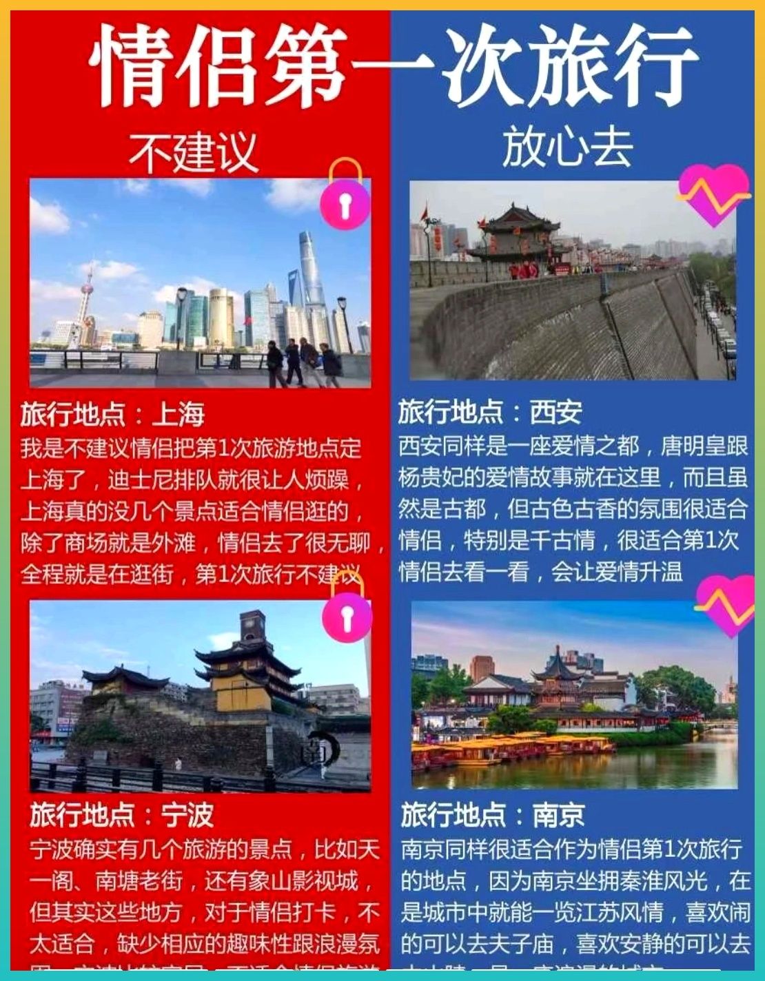 1. 旅行地大对决:城市选错,氛围全无!有些地方,看着风景美,但根本不适合第一次情侣游。比如高原、西北、险山大川——不信你看👇