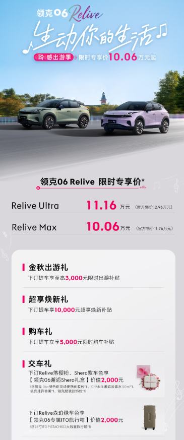 领克 06 Relive 的价格优势十分明显。只要 10 万出头,在金秋十月更是限时专享价 10.06 万元起,这对于刚踏入社会的年轻人来说,是一个非常实惠的选择。而且,在这个十月,购车还有多重福利。如果在十月下订并提车,有机会获得至高达 3000 元的限时金秋出游补贴礼、10000 元的超享焕新礼以及 5000 元的限时购车礼,交车时还有额外惊喜,这无疑为年轻人减轻了购车的经济压力。