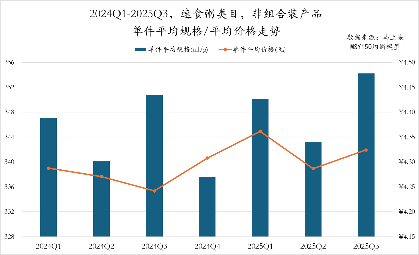 2024Q1-2025Q3,速食粥类目非组合装产品的平均规格呈现较明显的季度波动,两年的Q1、Q3均呈现高值。单价平均价格则平稳波动,2025年Q1-Q3的单件平均价格稍高于2024年各季度的平均水平。