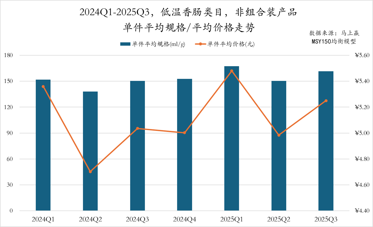 2024Q1-2025Q3,低温香肠类目非组合装产品单件平均价格呈现出明显的季节性变化,两年内的Q1都出现均价峰值,远高于其他季度。同比来看,2025年各季度的单件均价略高于2024年,件均价呈现一定的上涨趋势;单件平均规格上则整体较为稳定,也在两年的Q1出现峰值,2025Q3略有上升。