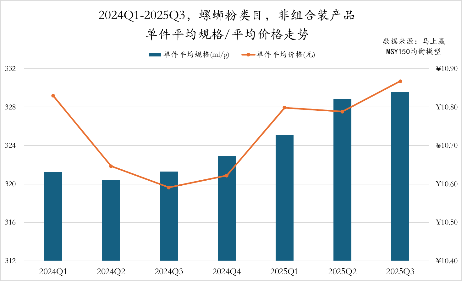 2024Q1-2025Q3,螺蛳粉类目的单件平均价格与平均规格走势整体保持一致,自2024Q3起,单件平均价格、平均规格都有一定的上升趋势,并在2025Q3达到平均价格/平均规格峰值。
