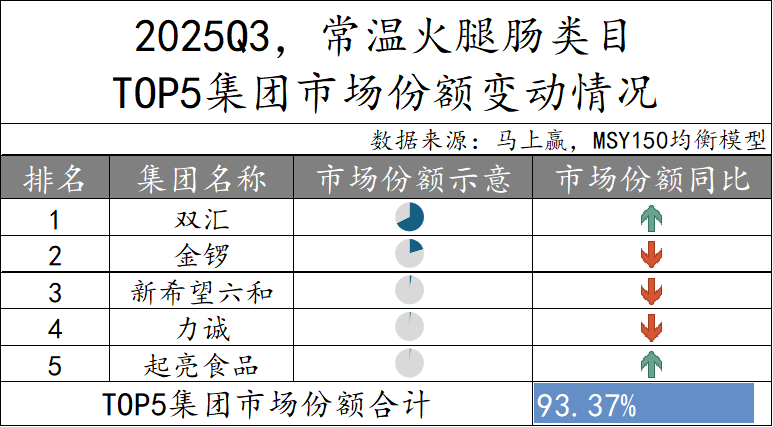 2025Q3,低温香肠类目TOP5集团分别为双汇、金锣、雨润、飘香和得利斯,市场份额合计71.53%,集中度较高但较上个季度有环比轻微下降。其中,双汇集团位居第一且占据了约50%的市场份额,但同比呈现下降;金锣位列第二,占据约15%的市场份额,同样呈现同比下降;排名第三-第五的雨润、飘香、得利斯市场份额均呈现同比提升,但市场份额都较小。