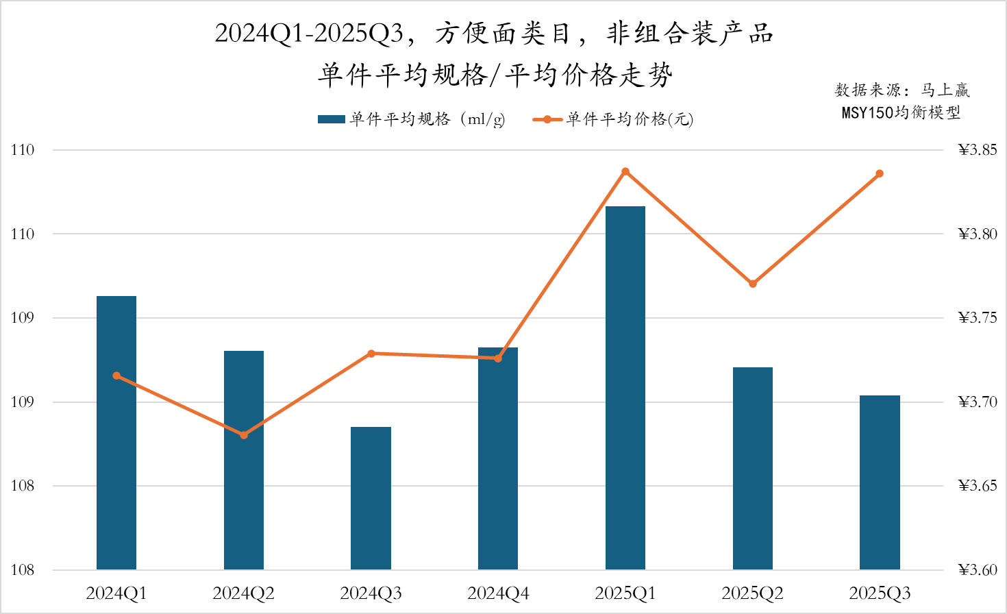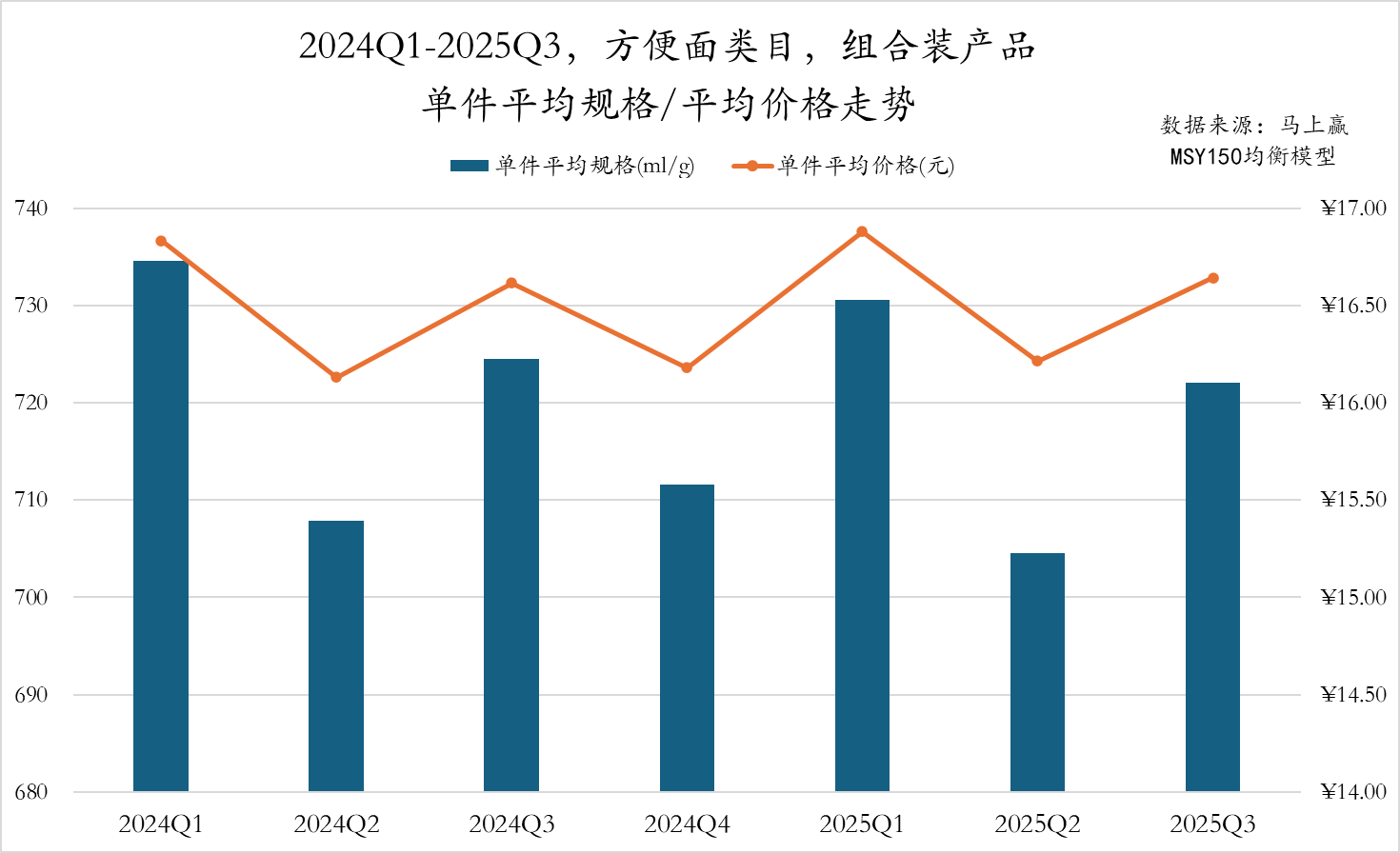 从方便面类目中的组合装产品情况来看,2024Q1至2025Q3的方便面类目单件平均价格和单件平均规格走势呈现出较为一致的趋势。整体来看,2025年的季度单件平均价格略高于2024年,但2025年的季度单件平均规格则略低于去年同期,同样显示出一定的“减量、提价”的迹象。