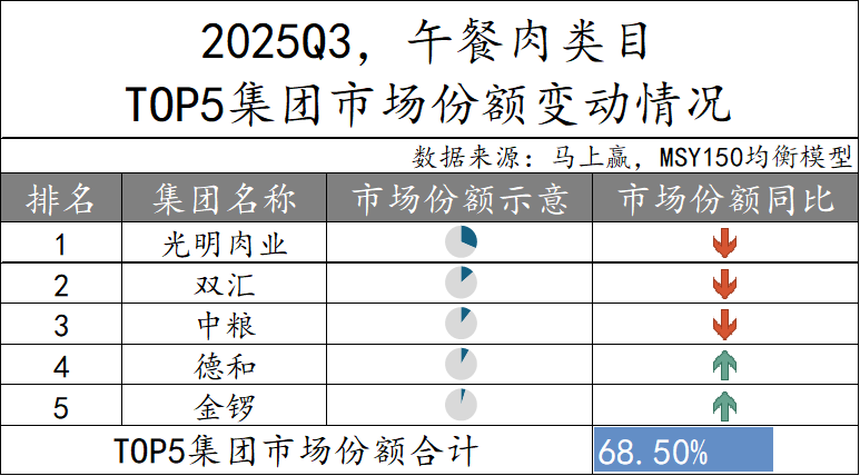 2025Q3,午餐肉类目TOP 5集团分别是光明肉业、双汇、中粮、德和和金锣,合计市场份额68.5%,环比上季度有极轻微的提升。其中光明肉业市场份额最高,是唯一市场份额超过1/4的集团。前三名的市场份额同比在下降,而第四名的德和、第五名的金锣市场份额同比出现上升。