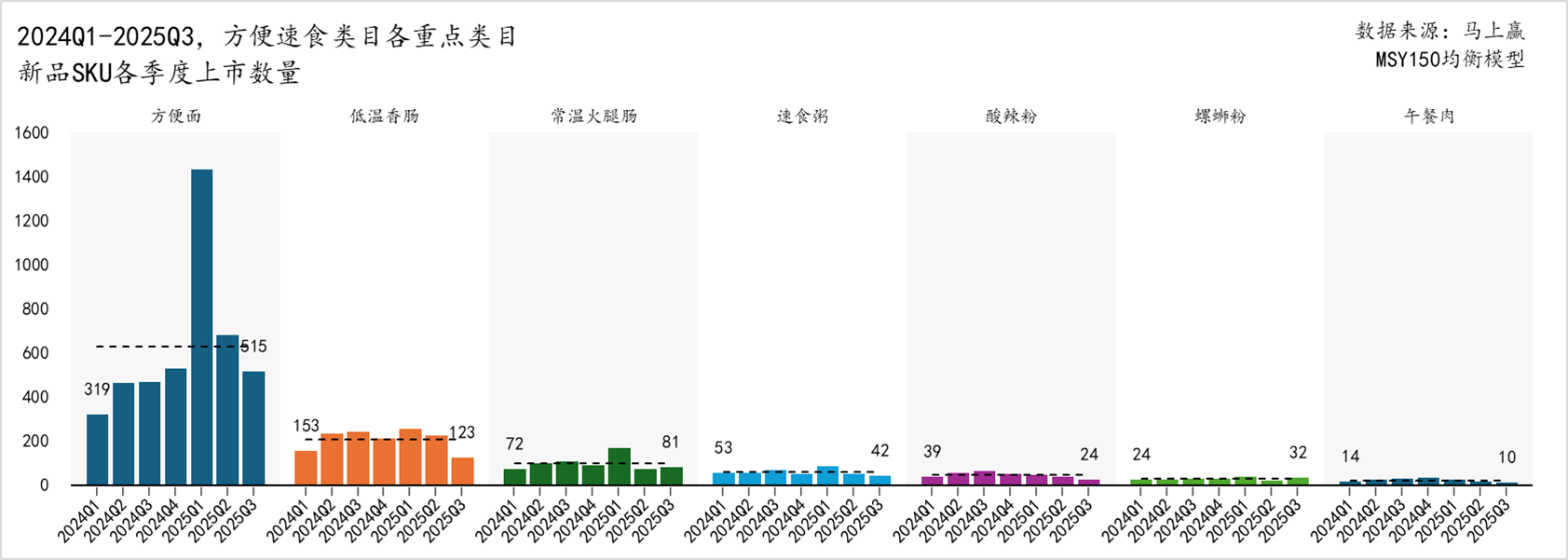 各类目上市新品上,方便面类目新品SKU上市数量在2024Q1-2025Q1保持增长,自2025Q1猛增达到将近1400的峰值后又回到了常规水平,2025Q2、2025Q3呈现连续下降。