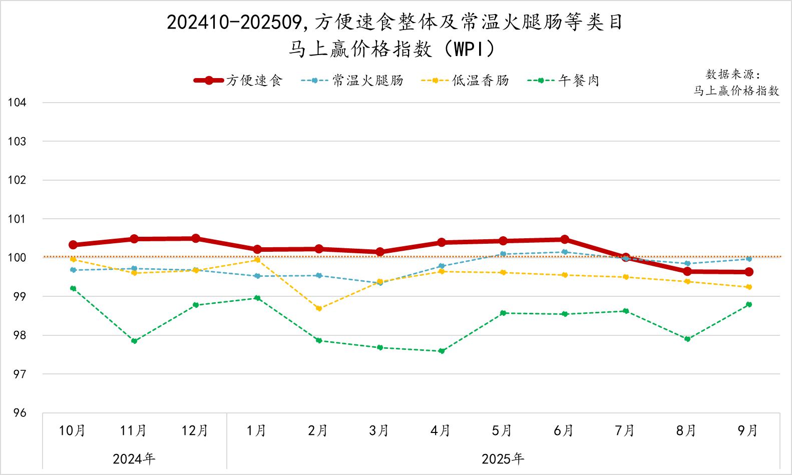 为了更好地分析方便速食类目价格的变动与走势,我们拉取了202410-202509,方便速食类目整体及各重点类目的马上赢价格指数(WPI,具体介绍参见:新产品丨马上赢价格指数(WPI)发布啦)。该指数以100为基准值,其数值上下波动为类目的价格指数与去年同期价格指数的相对百分比,100表示与去年同月持平,高于100表示同比价格水平上升,低于100则表示同比价格水平下降。