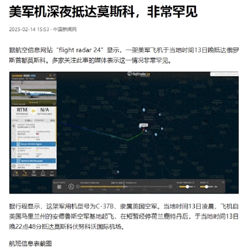 13日晚间,一架隶属于美国军方的C-37B运输机自马里兰州的安德鲁斯空军基地启程,其航向直指莫斯科的伏努科沃国际机场。