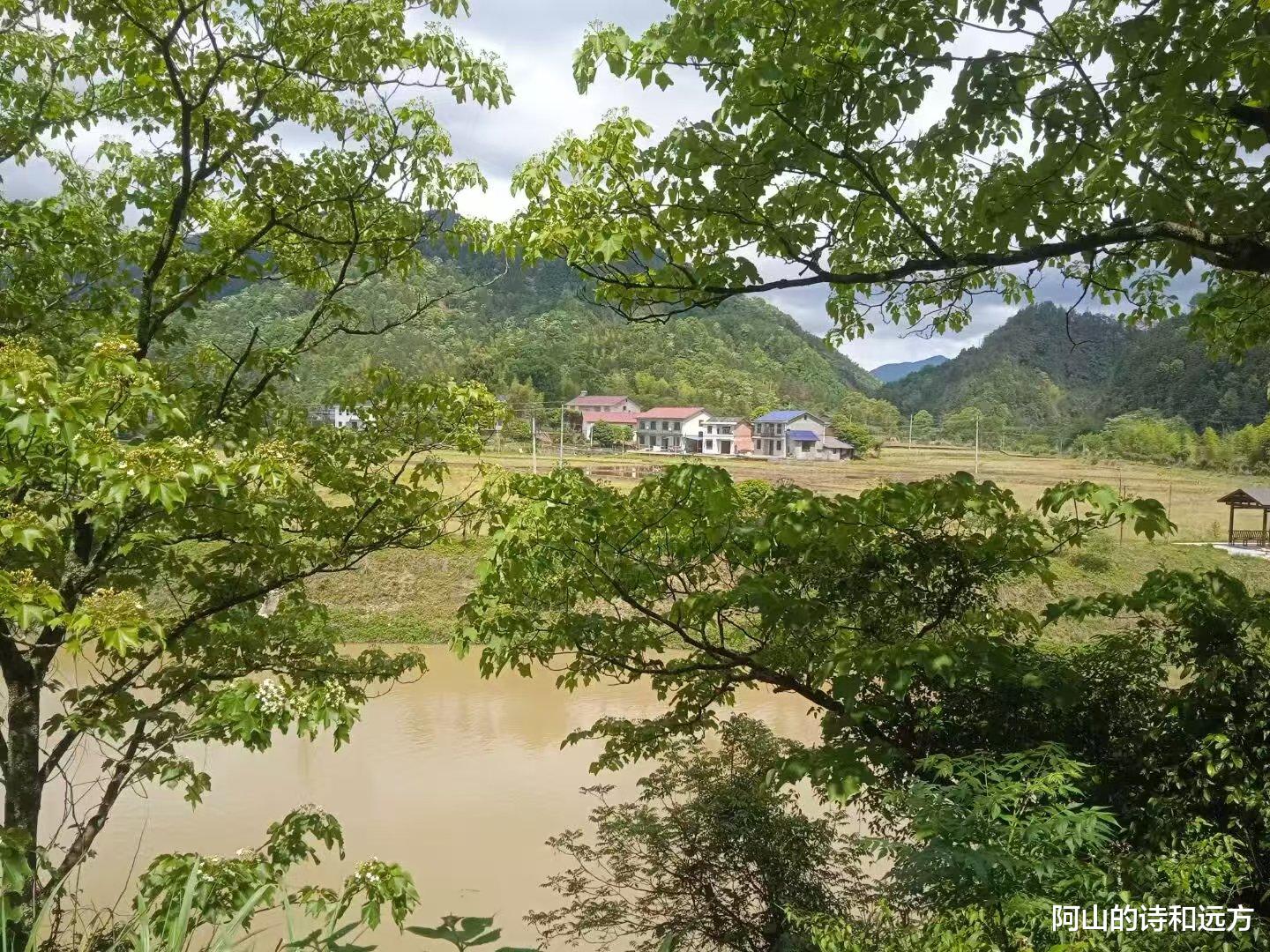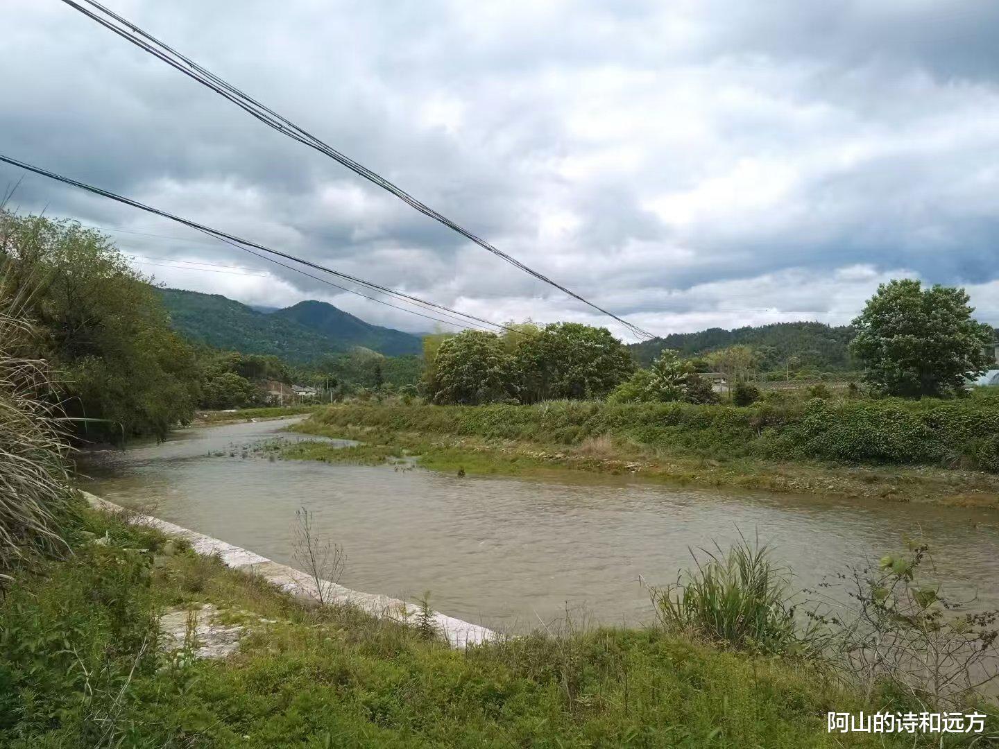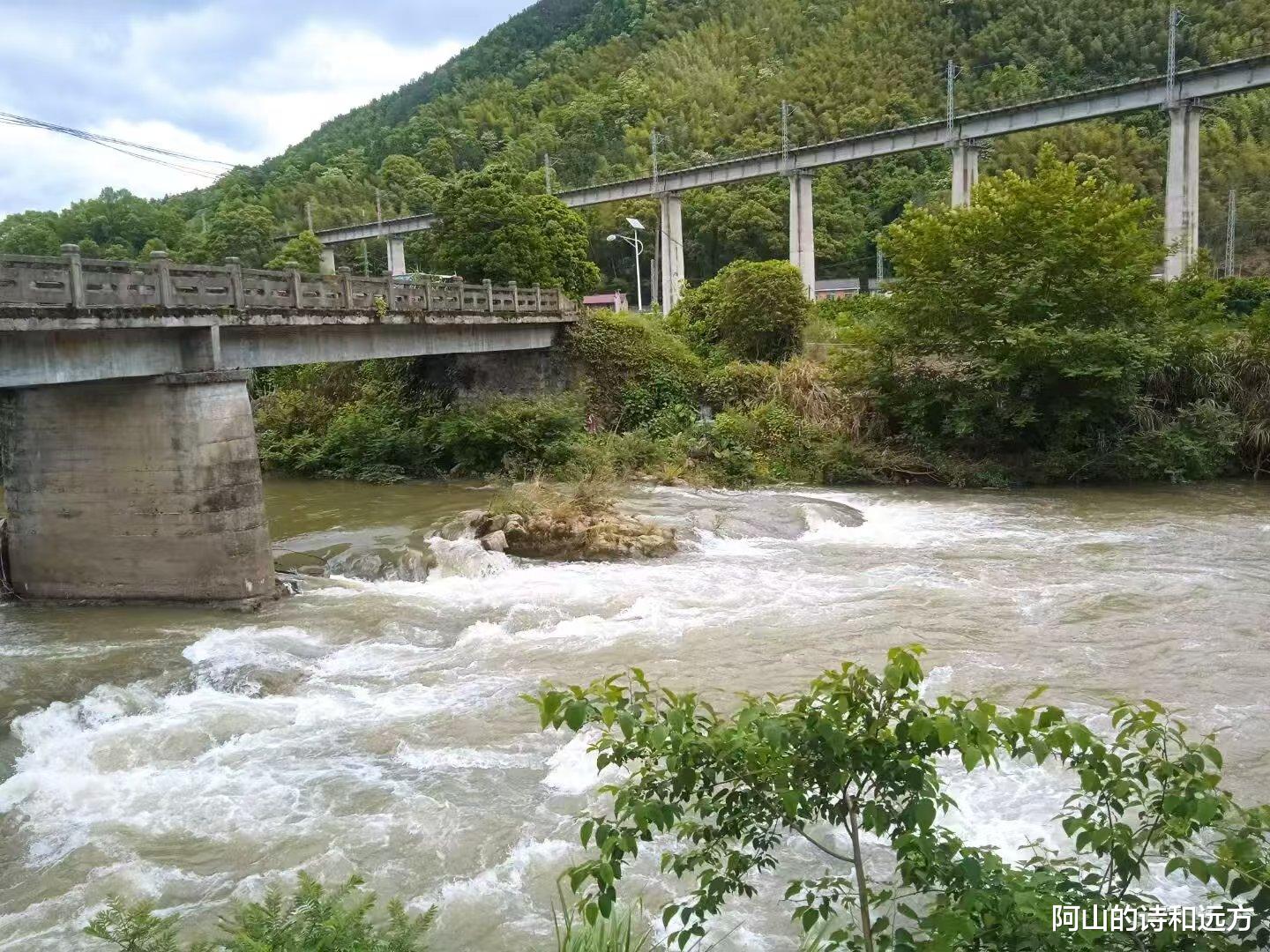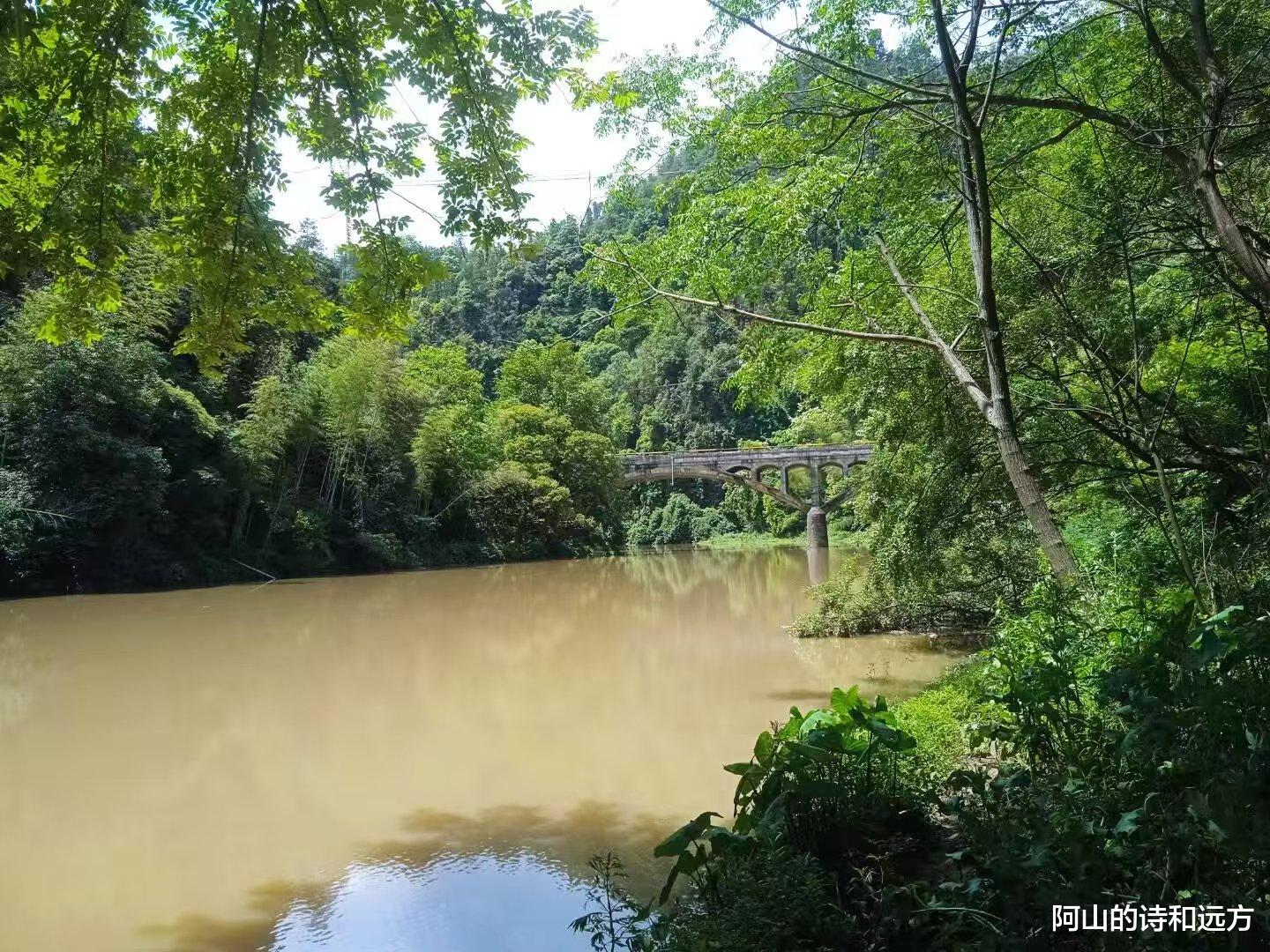 站在桥上往上下游看去,河水混浊,两岸不高的山连绵起伏,杂树丛生,草木青翠。河谷显得幽深和宁静。