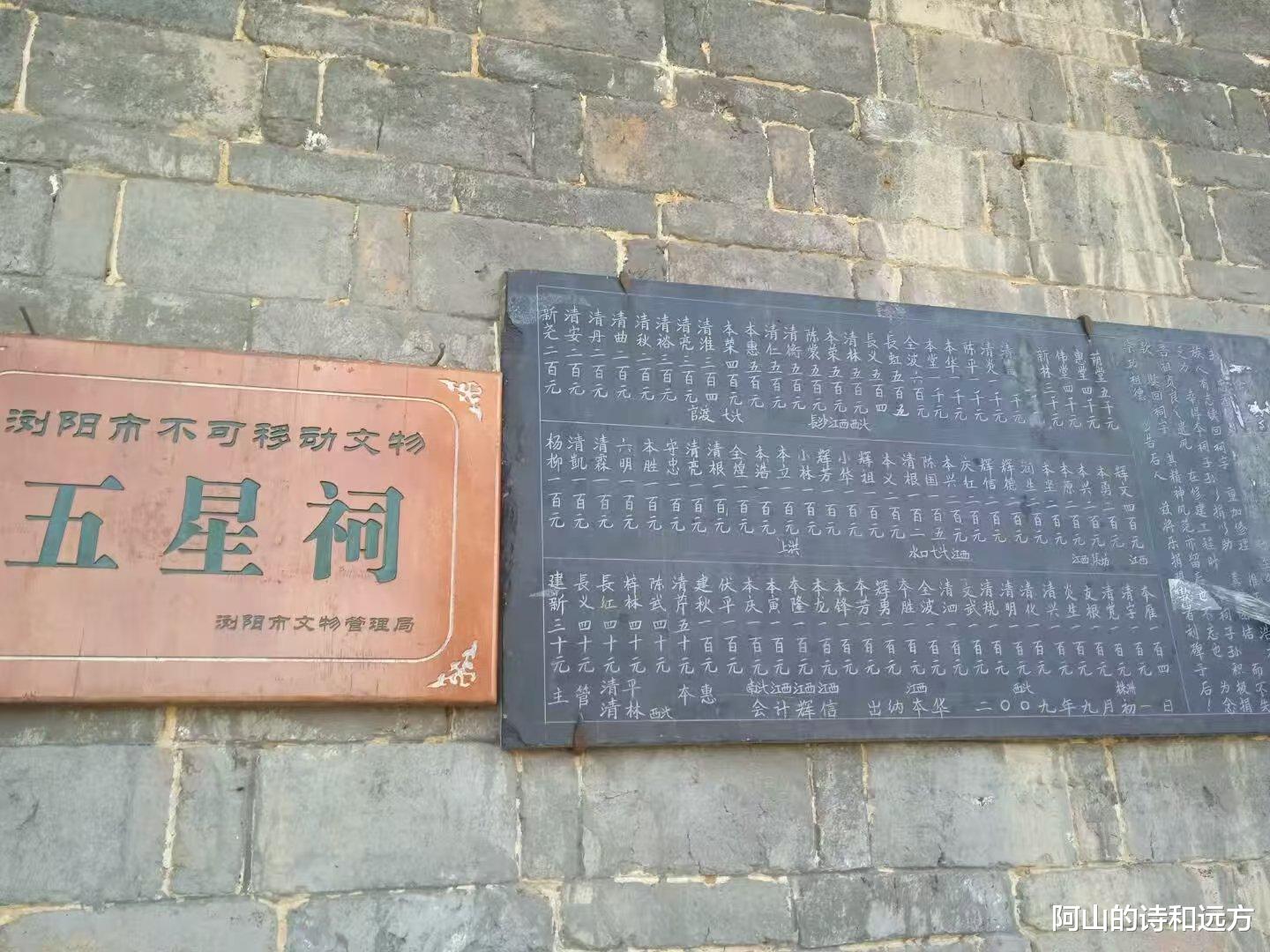 大门口右侧墙上,一块匾上书“浏阳市不可移动文物 五星祠 浏阳市文物管理局”的字样。匾右侧的黑板上书捐款名单,捐款数额30元到200元不等。