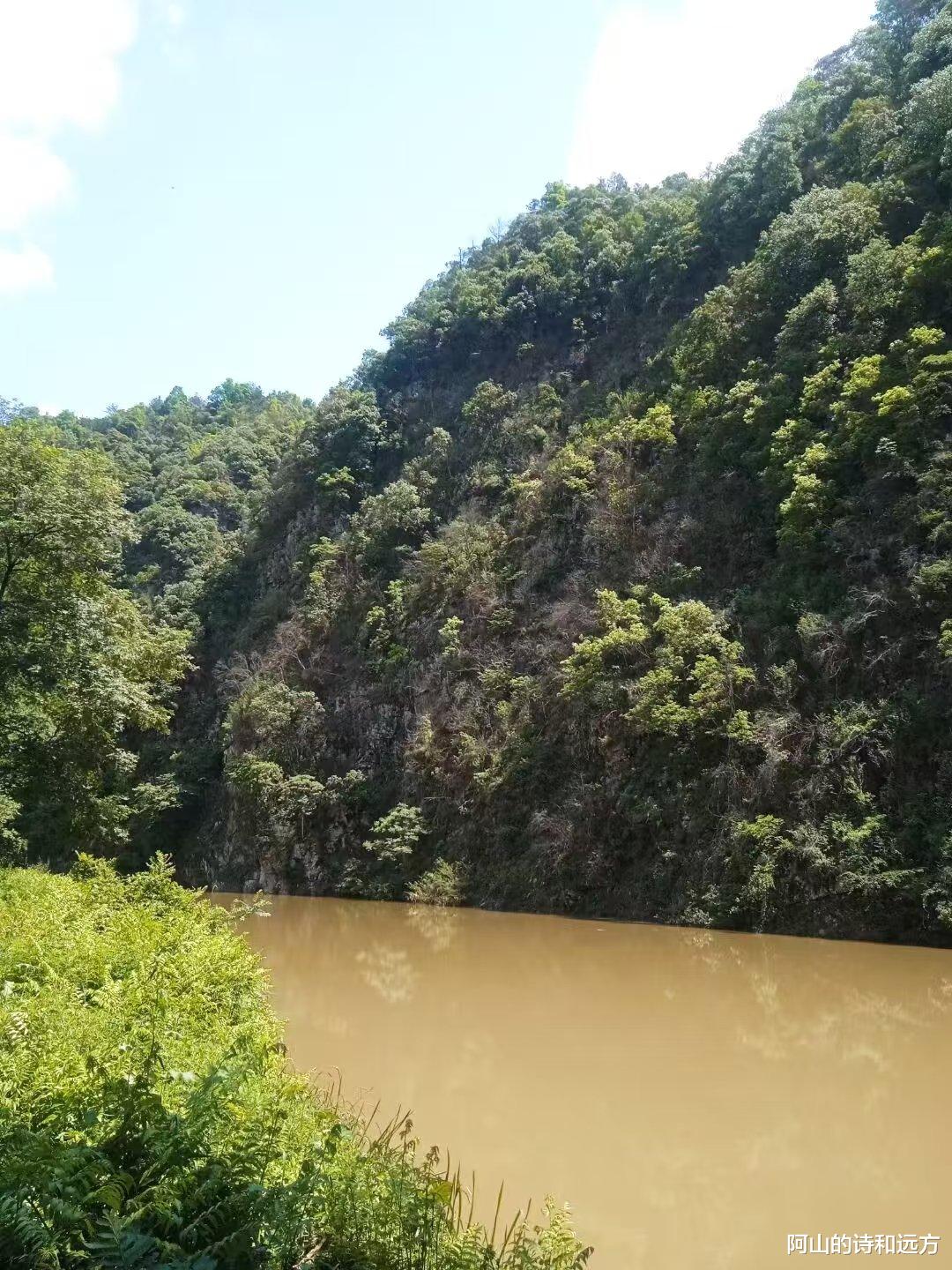 越往上游方向走,河道变得狭窄,岸边山崖陡峭。崖上杂木丛生,河水依然混浊。