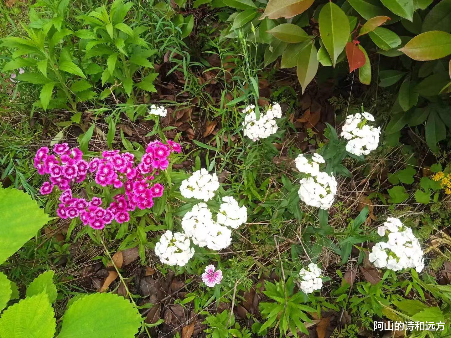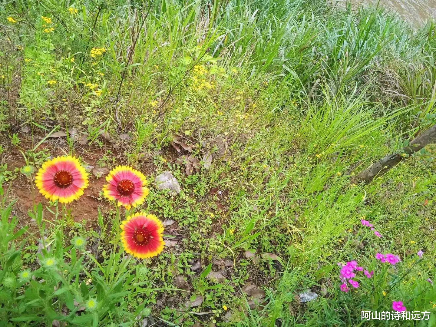 河岸的原野中出现了一些好看的野花,或黄或白,或红或紫,或粉白或淡黄,或三朵两朵的,或三五成群的,盛开在草丛中、地埂上,像星光闪烁在夜空,又像五彩的火花爆裂在眼前,让我禁不住驻脚观赏,用手机拍下她们的倩影。
