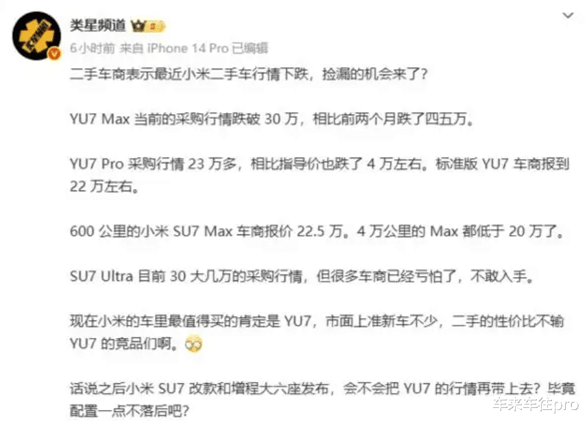 但短短几个月过去,这辆曾被称为“小米最贵情绪价值载体”的车,却成为二手车市场跌幅最狠的新星。