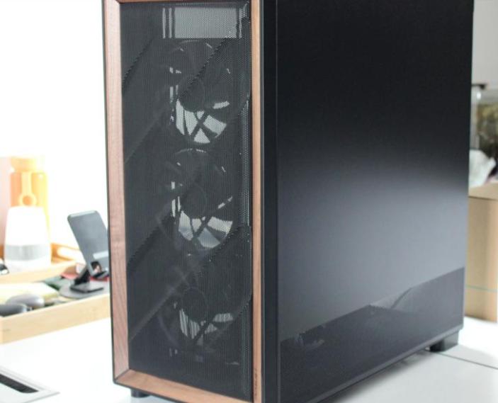 好水冷需好机箱承托,安钛克 FLUX 以 399 元价位,把 “材质质感、散热实力、性价比” 揉成了中端机箱的标杆,尤其在设计与散热的融合上堪称惊艳。它跳出了传统机箱 “金属黑匣子” 的沉闷感:前面板是精心设计的异材质交响 —— 冷轧钢板的利落、高透气铁网的通透,再配上北美胡桃木实木饰条的温润,外框四边用木条紧密贴合,勾勒出柔和的家居感。