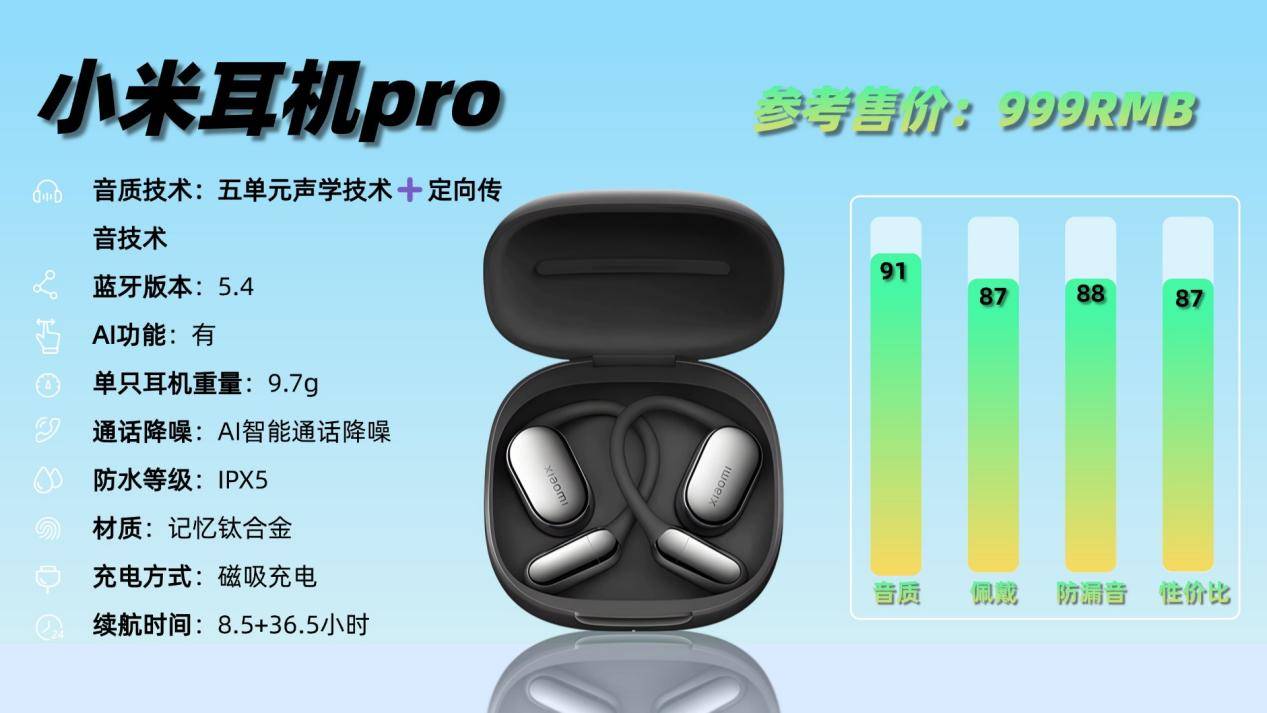 配置方面,耳机搭载蓝牙5.4芯片,实现低延迟、高稳定性的无线传输;总续航长达36.5小时,支持快充功能与多项智能交互操作。整体来看,小米Pro在音质、佩戴舒适度与功能实用性之间达成了出色平衡,以超越同价位产品的综合表现,成为开放式耳机市场的高性价比优选。