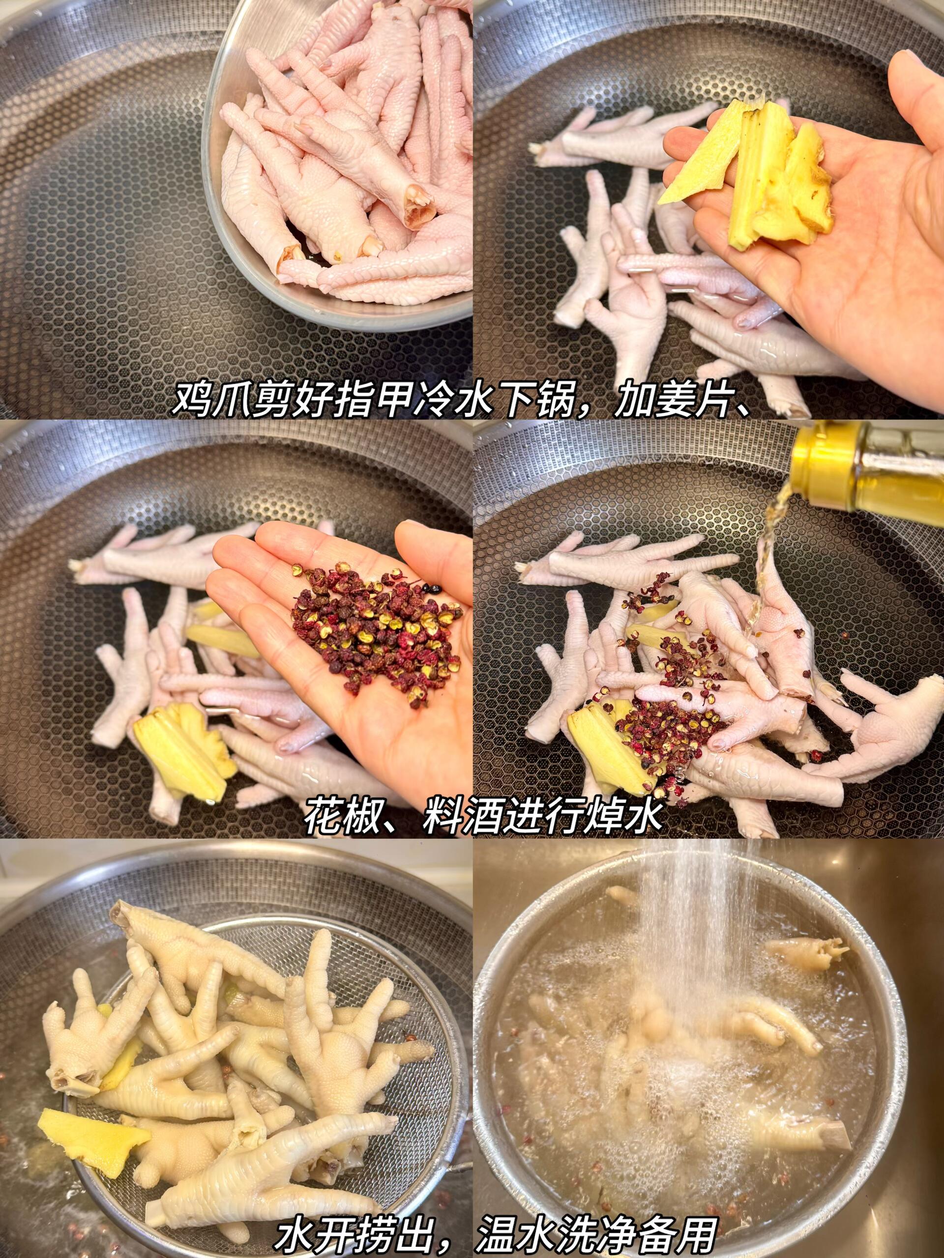 1. 鸡爪焯水:把新鲜鸡爪剪去指甲,冷水下锅,加入姜片、花椒和料酒。这里有个小技巧,冷水下锅能让鸡爪里的血水慢慢渗出,去腥效果更好。水开后,捞出鸡爪,用温水洗净备用。