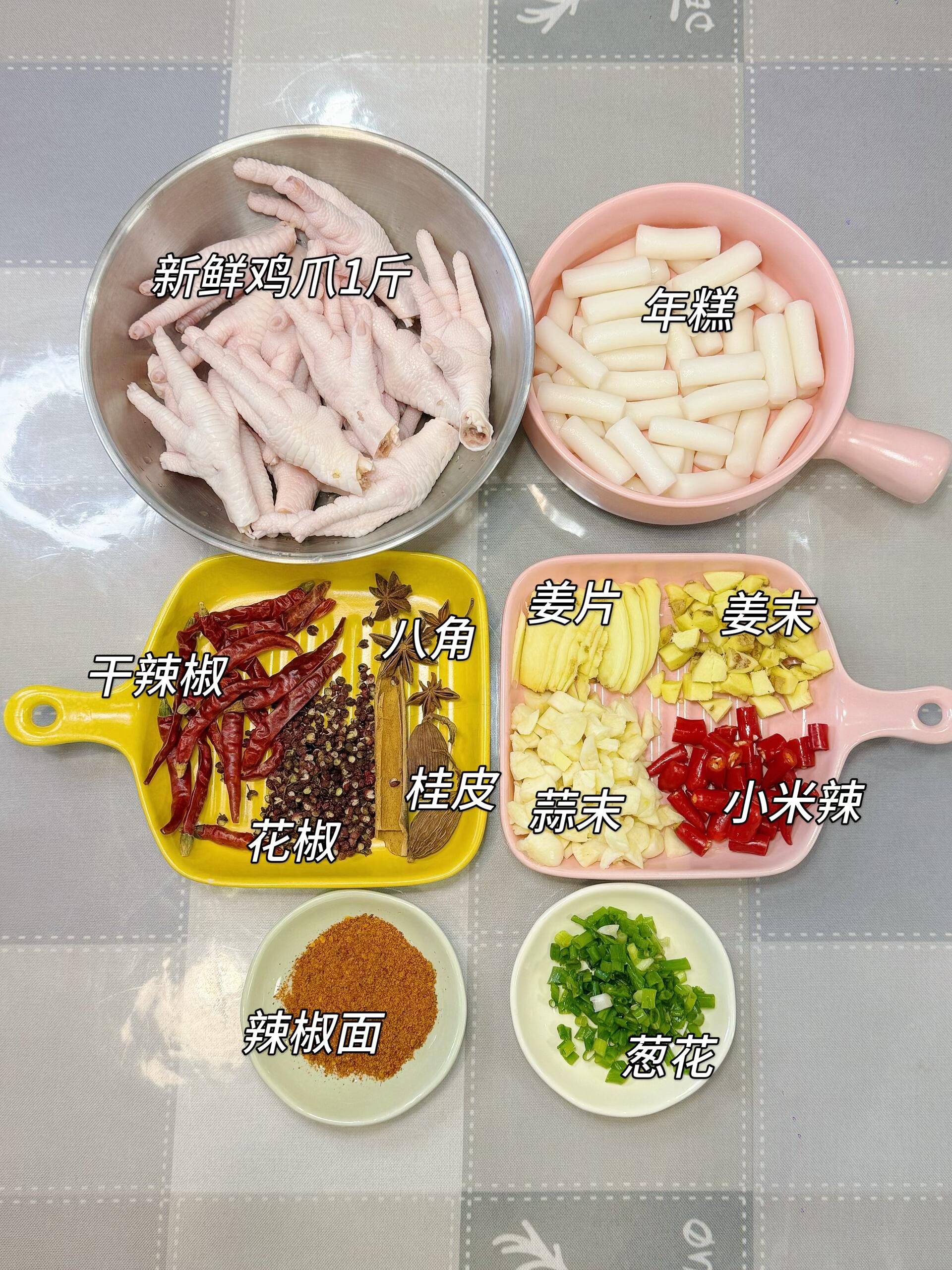 食材准备:新鲜鸡爪1斤、年糕适量、干辣椒、八角、桂皮、花椒、姜片、姜末、蒜末、小米辣、辣椒面、葱花。