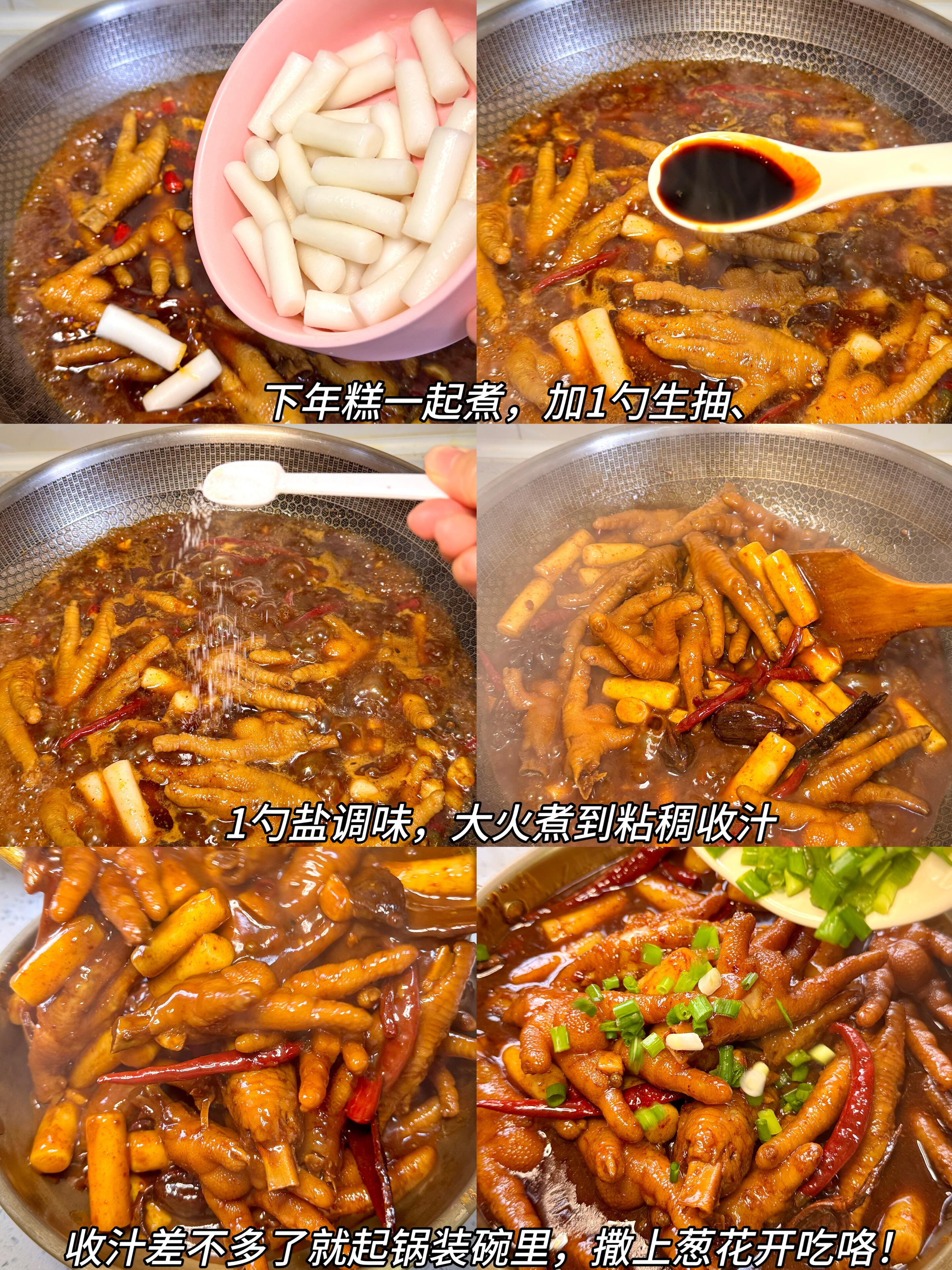 4. 合并烹饪:把卤煮好的鸡爪和汤汁一起倒入锅中,再加入年糕。接着加1勺生抽、1勺盐调味。大火煮到汤汁变得粘稠,年糕也吸饱了汤汁,变得软糯可口。在煮的过程中,要不时地搅拌一下,防止粘锅。