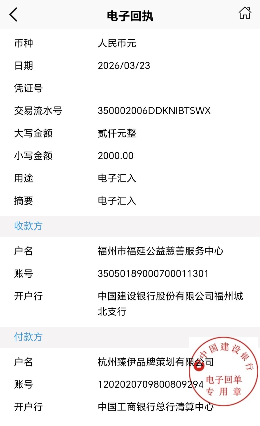 3月23日下午,福州的春风正拂过街巷,一笔标注着福延公益福蕾奖助学项目的2000元对公捐款,从杭州臻伊品牌策划有限公司的账户精准汇入福州市福延公益慈善服务中心。转账备注简洁而郑重,没有多余修饰,却藏着一段跨越山海、素不相识却心意滚烫的爱心故事。